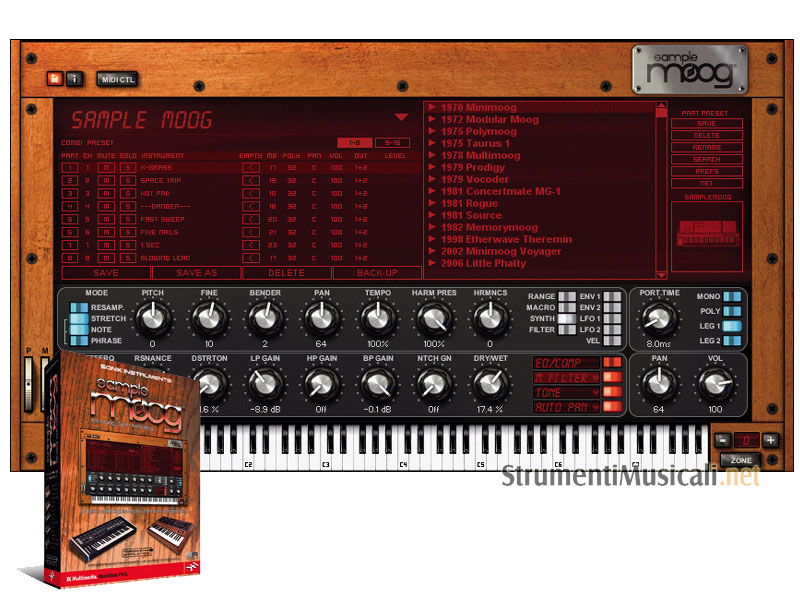 SampleMoog offers over 1,700 basses, leads, pads and effects sounds from the very first Moog Modular systems to rare Minimoogs to Taurus™ Bass Pedals, Polymoogs, Memorymoogs and more. Whether you want a lead sound or a phat R&B synth bass or swirling fx, this is the ultimate source for everything Moog! Load up monster Moog Modular patches, pull up the powerful rumbling sound of Moog Taurus 1 Bass pedals and shake the house! The SampleMoog takes you back in time to the days of analog and honors one of the founding fathers of synthesis, Bob Moog. An homage to the incredible range of instruments from the first Etherwave® Theremin to the latest Minimoog® Voyager®, this virtual instrument is a must-have for any fan of the “Moog Sound” as well as an analog synth powerhouse for any music style.