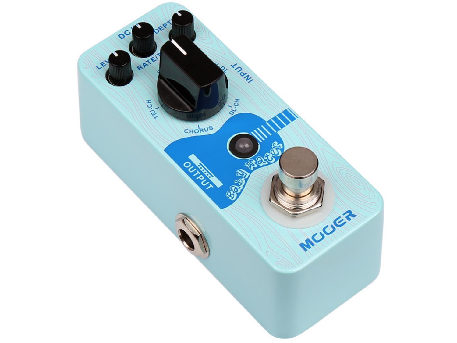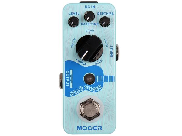 Il Mooer Baby Water è stato appositamente progettato per coloro che amano la chitarra acustica. Con una piattaforma effetto digitale di alta qualità, è possibile ottenere effetti Chorus o Delay puri dal selettore rotativo, si può anche ottenere l'effetto interconnesso con chorus e delay. Il Baby Water offre cinque suoni. CHORUS che propone il suono chorus classico; TRI-CHI un triplo chorus che rende l'effetto più profondo; la modalità di ECHO offre il suono caldo di un effetto delay simulato; CH-DL ti dà la possibilità di sperimentare l'effetto interconnessione Chorus e Delay; DL-CH aggiunge il suono di chorus basato sull'effetto Delay. La cosa più importante è che si potrebbe ottenere un effetto simile ad un riverbero regolando le manopole Time e Feedback basate su questi due suoni interconnessi.