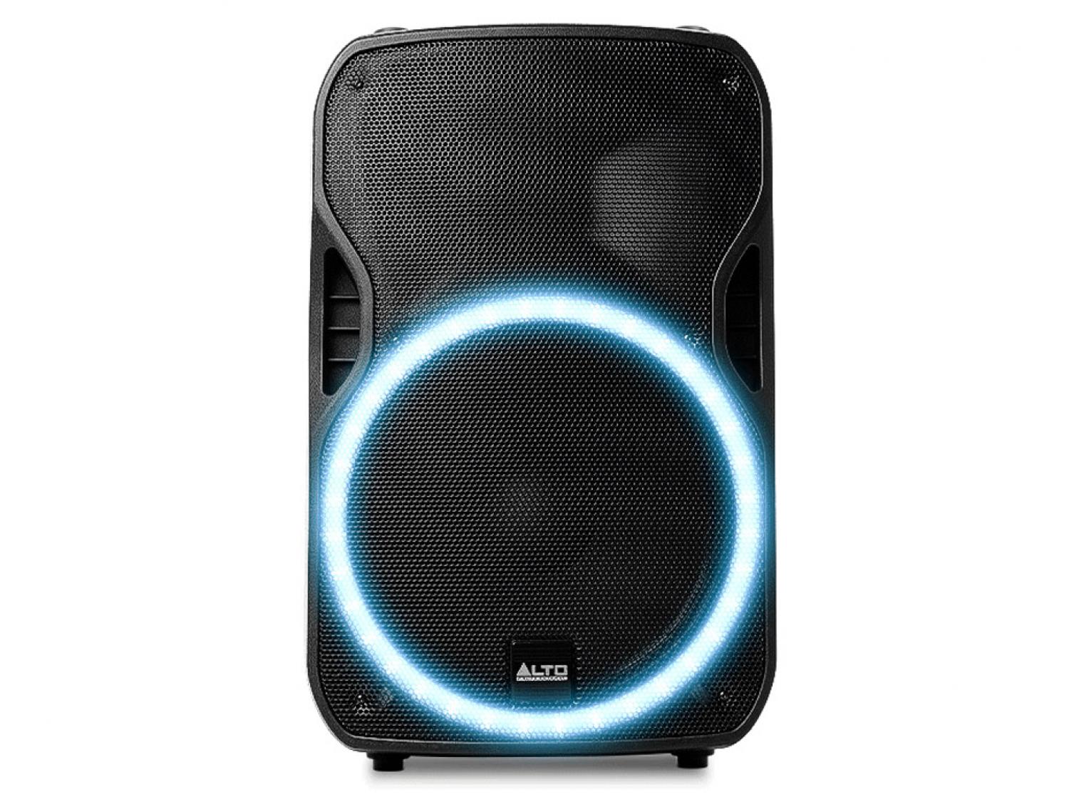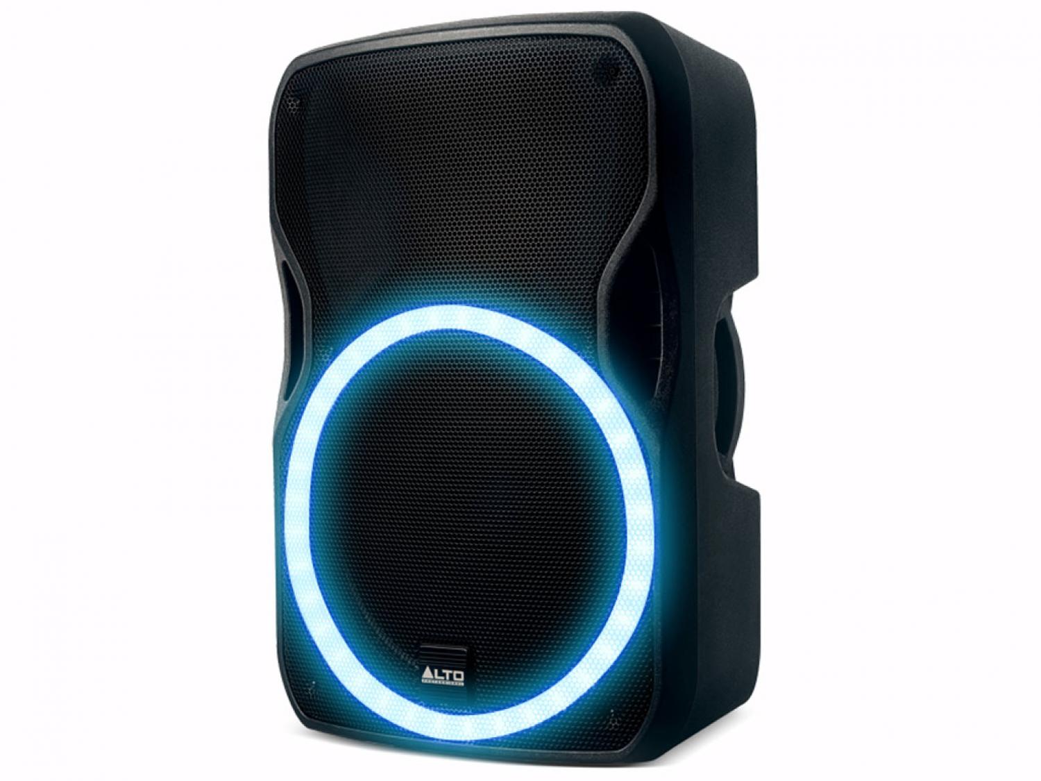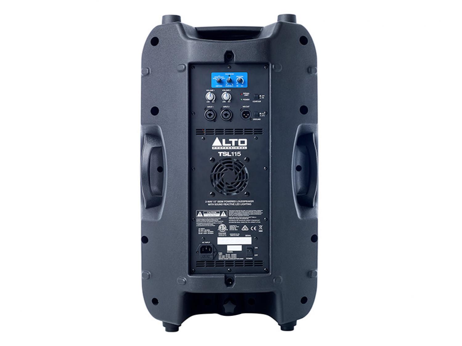 Alto Professional TS115L è una particolare versione della cassa bi-amplificata Truesonic 115A da 800W di picco nella quale è stata aggiunta una corona di LED RGB che si estende sull’intera circonferenza del woofer. I LED sono programmabili mediante tre potenziometri e configurabili in 5 differenti modalità operative: Mood, per emettere una luce fissa, Meter, per simulare il comportamento di un LED meter che si muove a seconda dell’intensità della musica, Mix, per variare la colorazione delle barre luminose a seconda del contenuto in frequenza dell’audio riprodotto (rosso per le basse, verde per le medie e blu per le alte), Pulse, per emettere impulsi luminosi nella colorazione impostata con il potenziometro “Color Select” e dalla luminosità assegnata tramite il Brightness, e quella Party che genera differenti giochi di luce a seconda delle regolazioni degli altri potenziometri. I cabinet dei diffusori a 2 vie della serie TRUESONIC sono stati progettati per la massima versatilità e per durare nel tempo. Il materiale impiegato nella costruzione è il leggero e duraturo polipropilene, quindi ideale sia per le installazioni itineranti, sia per le location fisse Il design trapezoidale permette una riduzione delle risonanze interne al cabinet, per una migliore ed efficiente resa sonora. Anche i driver della serie sono stati disegnati per far si che non si disperda energia in fase di trasduzione, e ciò si traduce in una migliore resa dell’amplificatore integrato: più suono, meno calore e un miglior rispetto delle specifiche dichiarate. Per quanto riguarda l’amplificatore integrato, la serie amplificata dei diffusori TrueSonic trae beneficio dall’impiego di un amplificatore in classe D. Gli ampli in classe D sono generalmente più leggeri rispetto a quelli progettati in classe A e AB, fornendo comunque una potenza ottimale necessaria all’ottenimento di un suono potente.