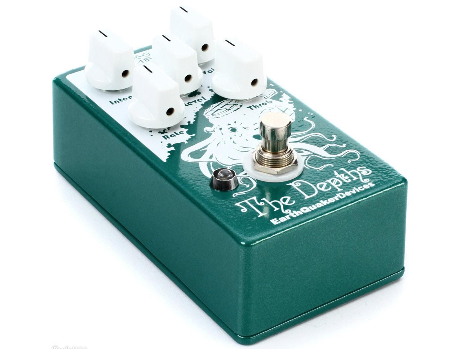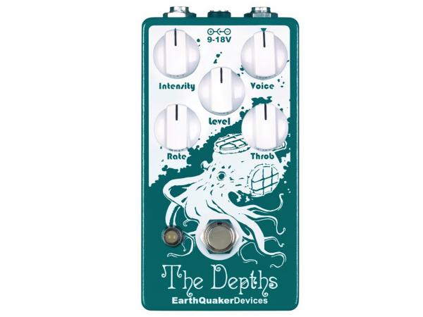 The Depths è il contributo di EarthQuaker al classico circuito ottico vibe. Crea un rigoglioso impulso di phasing che offre un suono vorticoso tridimensionale. The Depths è stato ottimizzato per funzionare bene con tutti i tipi di strumenti, tipi di pickup e con i suoni sporchi. Con i suoi controlli "Voice", "Throb", la profondità può raggiungere suoni dal sottili e delicati a caldi e profondi. I controlli "Intensity" e "Rate" vanno da morbidi e lentissimi gorgheggi a rapide e taglienti esplosioni per ottenere più dei classici effetti vibrato. Il "Level" permetterà di aumentare il segnale ben al di sopra dell'unità per compensare qualsiasi perdita di volume che si trova comunemente nei pedali Vibe. In aggiunta a tutto ciò che, può essere alimentato a 9V per toni più caldi o a 18V per un suono più rigido con più headroom e brillantezza.