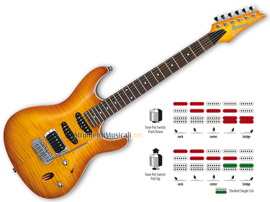• Single coil AHS1 (manico) + single coil AHS2 (centro) + humbucker True Duo Bucker (ponte)