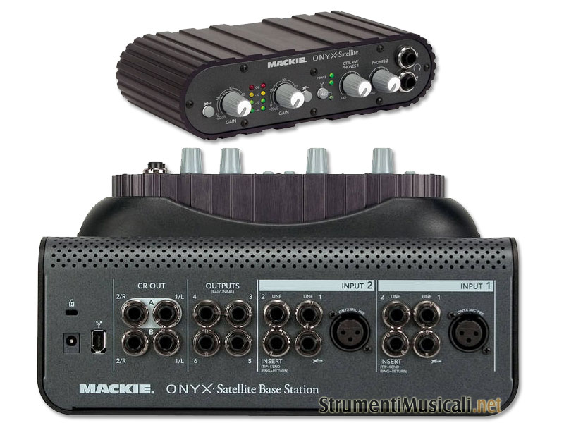L'Onyx Satellite apre una prospettiva totalmente nuova alla registrazione digitale su computer, infatti è composto da due parti, la sezione portatile (POD) con preamplificatore/convertitore e la docking station che aumenta la versatilità aggiungendo ulteriori ingressi ed uscite. La sezione portatile è molto compatta e robusta (chassis in alluminio/acciaio) e consente di collegare ai due ingressi Combo posteriori segnali microfonici (con interruttore per Phantom 48V), strumentali (grazie all'interruttore per segnali ad alta impedenza) e linea. I due controlli GAIN hanno indicatori di livello con 4 led da -40 ad OL mentre le due uscite anteriori per le cuffie hanno volumi indipendenti, quello della prima funziona anche per l'ascolto dalle uscite CONTROL ROOM. Il pannello posteriore è completato dal connettore multipolare per la docking station la presa Firewire, il connettore per l'alimentazione e il gancio per il lucchetto Kensington. La docking station comprende ingressi indipendenti per Microfono, Strumento, Linea 1 ed aggiunge Linea 2 ed Insert, con possibilità di gestione immediata tramite gli interruttori frontali, consentendo di lasciare collegati contemporaneamente fino ad otto segnali! Il pannello anteriore della docking station comprende anche un microfono di Talkback con livello ed interruttori per le cuffie o il software di registrazione digitale. Infine il livello della CONTROL ROOM può gestire due coppie di monitor stereo differenti (uscite CR OUT A & B) ed un sistema Surround proveniente dal software di registrazione digitale (tramite le uscite CR e le uscite aggiuntive 3-6 del pannello posteriore). Ovviamente anche l'Onyx Satellite è fornito del potente software di registrazione digitale multitraccia Tracktion 2, molto apprezzato dai musicisti per l'estrema semplicità ed intuitività grazie all'ottimizzazione della gestione in una singola pagina! Si può ben affermare che il Mackie Onyx Satellite rappresenta la soluzione ideale per tutti i musicisti che vogliono avere la libertà di registrare ovunque e lasciare a casa lo studio completamente montato e pronto per qualsiasi sovrincisione e missaggi.