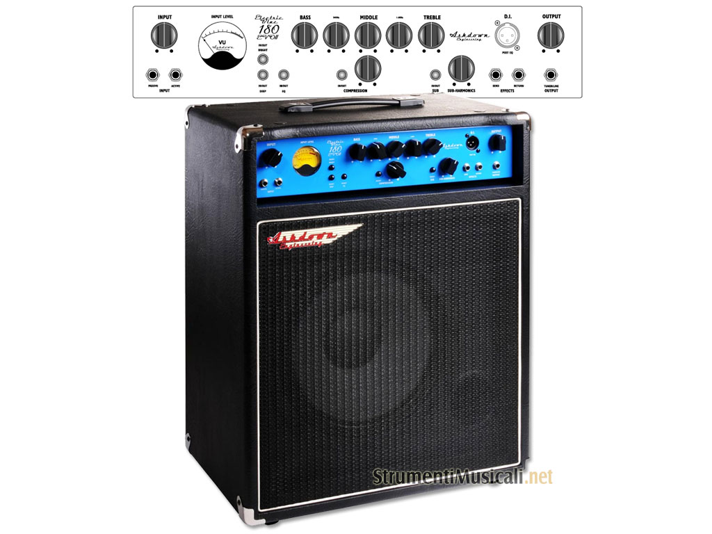 Electric Blue Combo 180W RMS con un cono da 12" Ashdown MAG BLUE LINE, Griglie nere di metallo resistente, Costruzione di Multistrato resistente, Coperture di moquet, Angolari in plastica.