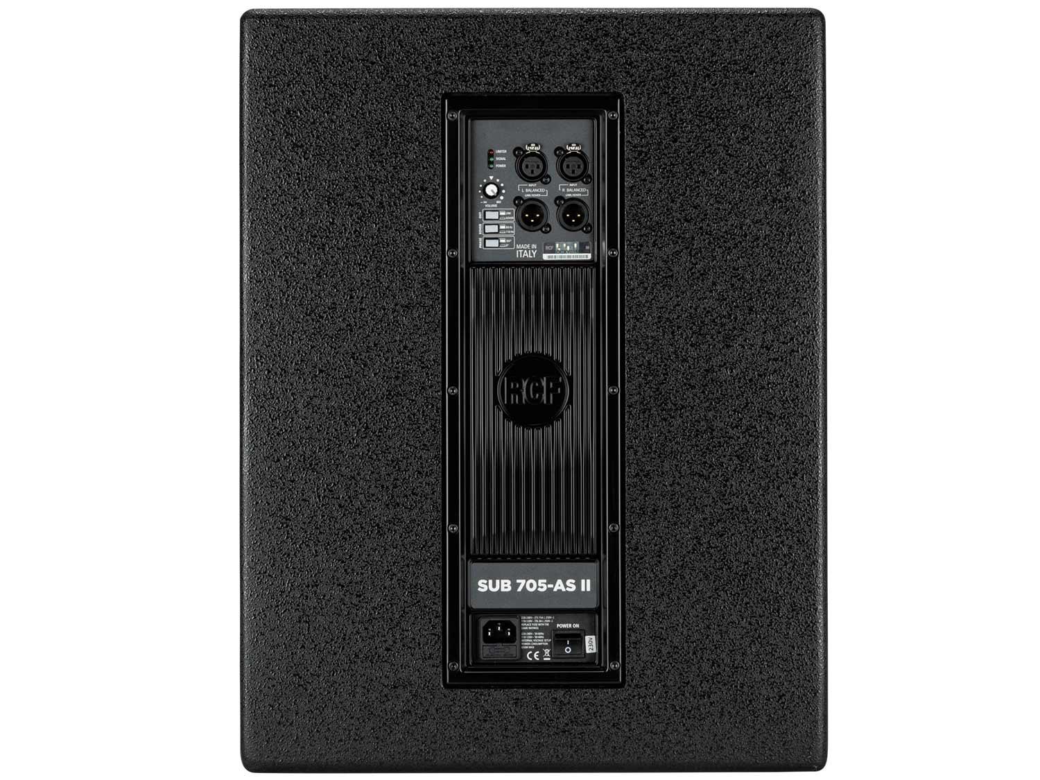 Il SUB 705-AS II è un subwoofer bass reflex, compatto e potente. Esso è dotato di un woofer 15" ad alta potenza con bobina da 3" , alimentato da un amplificatore digitale da 1400 Watt in un robusto contenitore di compensato ottimizzato per bassi potenti. Grazie al crossover stereo digitale (DSP) incorporato con frequenza di crossover regolabile, può essere facilmente e rapidamente installato con un diffusore satellite. Il SUB 705-AS II si abbina facilmente con sistemi 12" e 15", ideale per RCF ART e Serie D-Line.