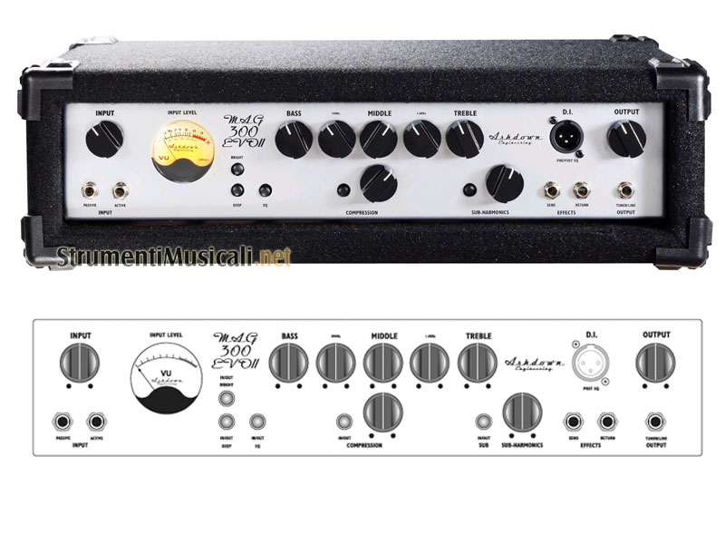 La testata MAG 300H è dotata di una nuova potente sezione di potenza ventilata da 307 Watt RMS. I comandi rotativi di bassi, medi e alti sono integrati da piccoli controlli rotativi che forniscono 15dB di taglio e di boost a 220Hz e 1,6kHz, fornendo una completa sezione di EQ a cinque bande. Inoltre, gli interruttori del pannello frontale per le impostazioni Bright e Deep, forniscono un accesso immediato a suoni richi di attacco, caldi e arrotondati, in materia di risposta nella basse frequenze, il generatore sub-armonico Ashdown è pronto ed in grado di fornire camoinate di suono se attivato. Sono previsti ingressi per strumenti attivi e passivi, il pannello frontale dispone anche di mandata e ritorno effetti, un uscita tuner/line e di una uscita DI bilanciata per il collegamento diretto ad un mixer.