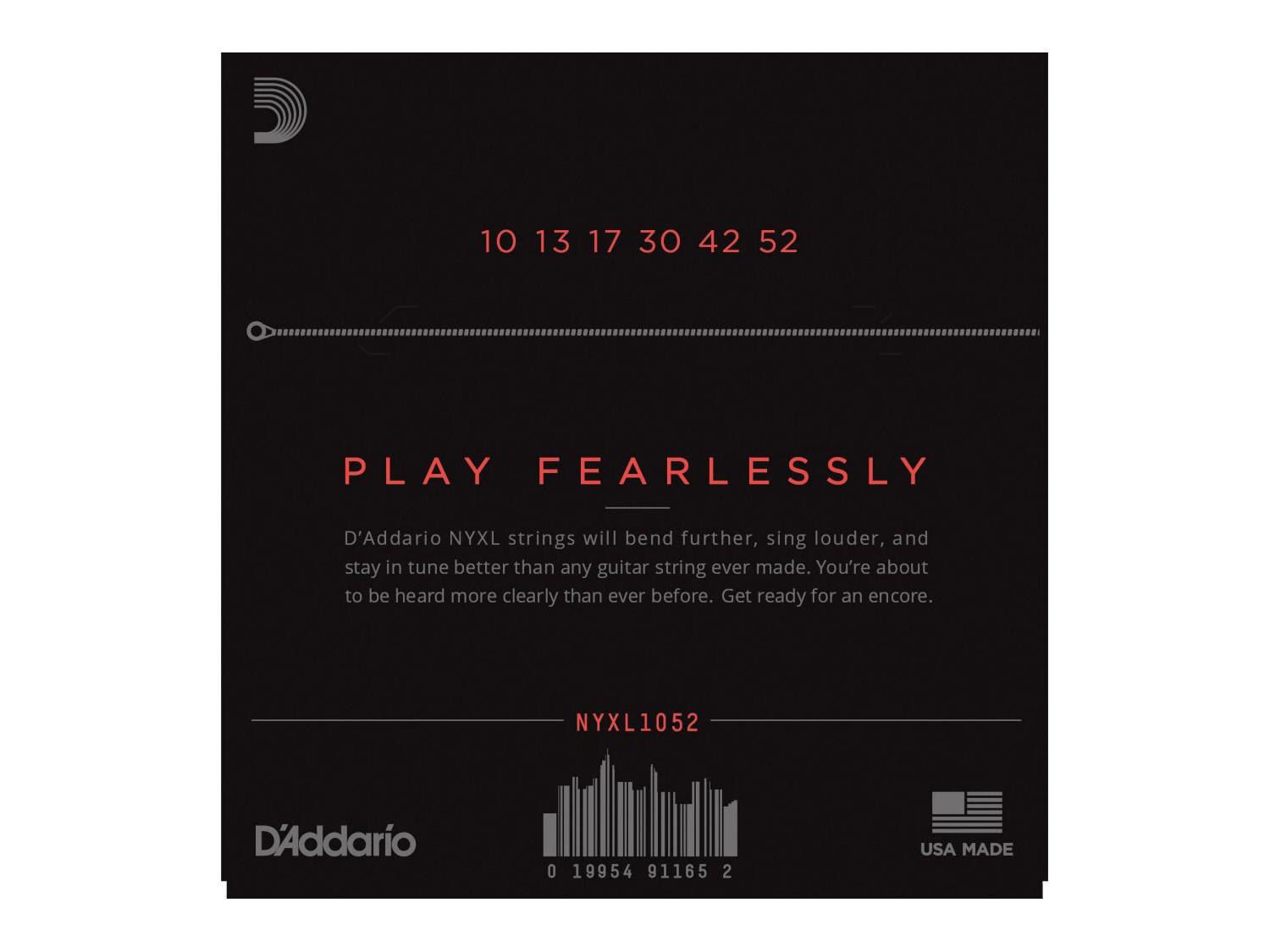 Le corde per chitarra NYXL1052 sono un set ibrido, che combina le corde alte di un set light normale (.010), con corde basse più spesse (.052). Questa combinazione fornisce un potente fascia bassa per accordi heavy e corde di acciaio flessibili per il bending. Le corde per chitarra D'Addario NYXL si flettono di più, suonano più forte, e rimangono accordate meglio di qualsiasi altra corda che tu abbia mai usato prima. Concepite, sviluppate e prodotto da D'Addario a New York, questa corde con anima in acciaio ad alto tenore di carbonio, resistenti alla rottura, di nuova concezione offrono un nuovo livello di libertà, sicurezza e potenza.