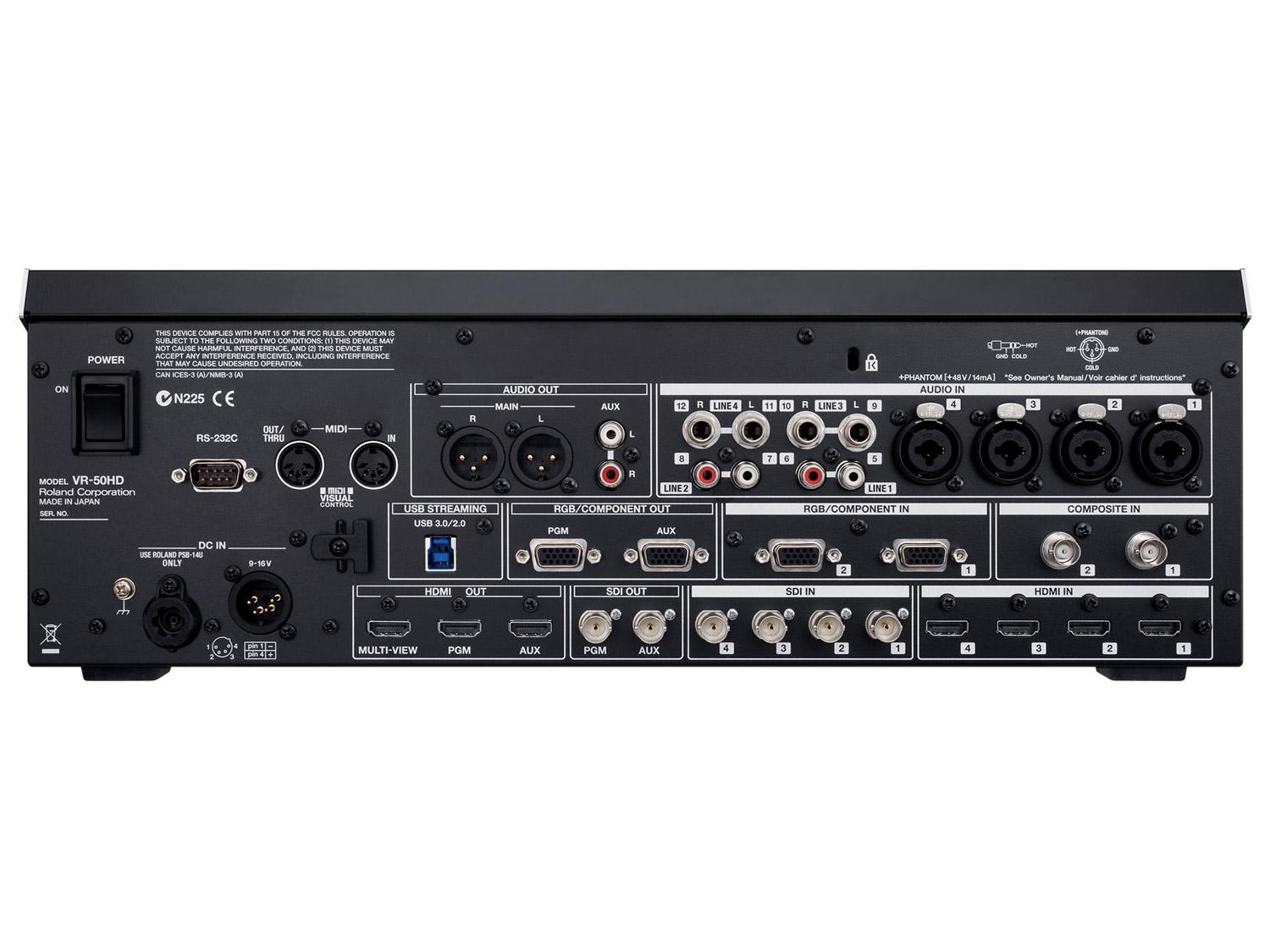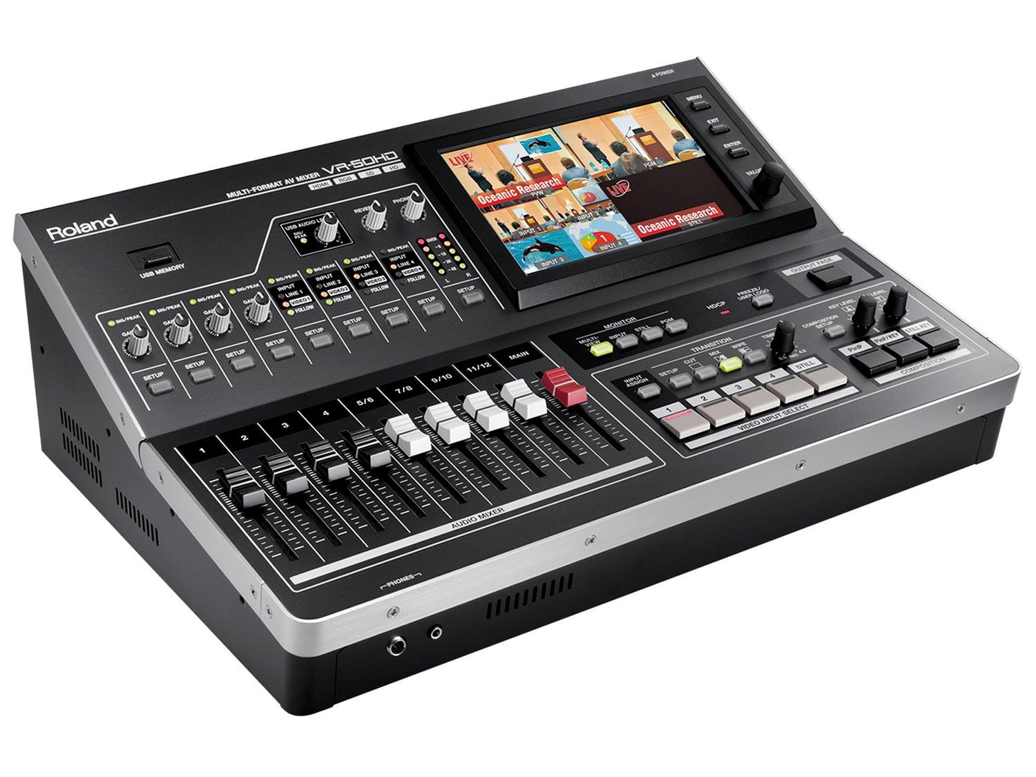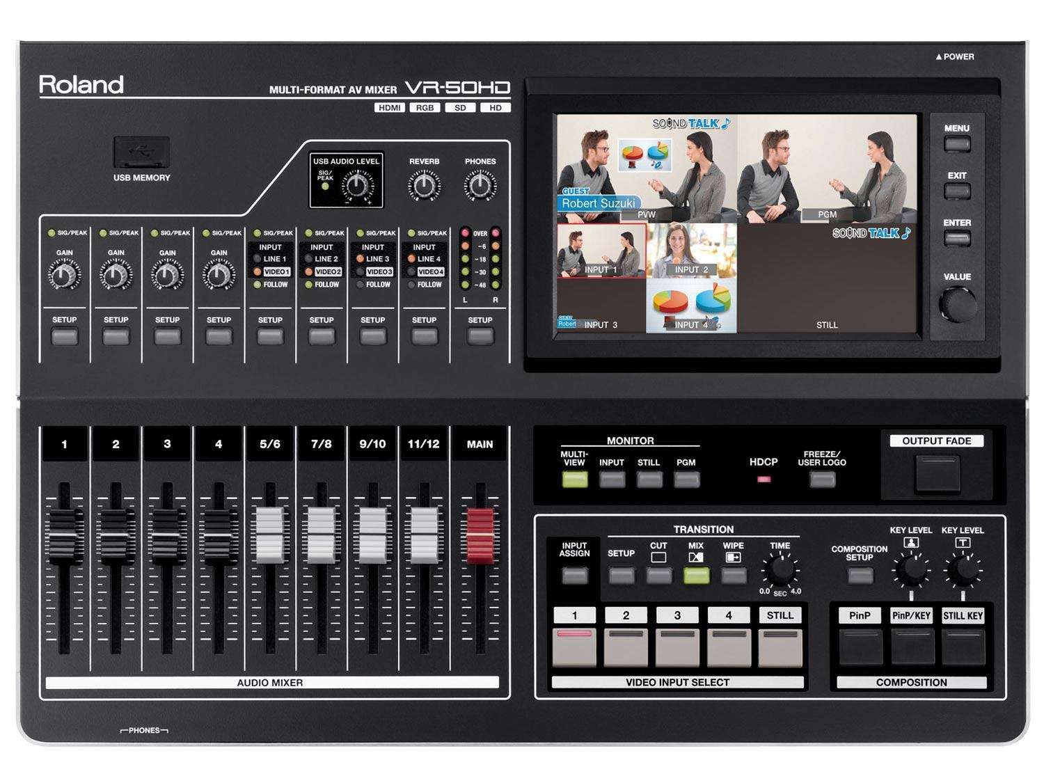 Un studio portatile HD completo in una singola unità. Suono e immagini controllabili da una singola persona usando fader, pulsanti e touch screen. Il mixer all-in-one AV Roland VR-50HD integra splendidamente un mixer audio, switcher video, touch screen multi-viewer e streaming video / audio USB in un dispositivo indipendente. Questa singola unità offre funzionalità che fino ad ora richiedevano l'uso di diversi periferiche. Una soluzione portatile per la produzione HD live è ideale per scuole, luoghi di culto, eventi aziendali, sport, corsi di formazione, o qualsiasi altro evento live. È possibile collegare le telecamere, computer, lettori Blu-ray, lettori DVD, microfoni, iPad, etc, come dispositivi di input, senza doversi preoccupare se l'apparecchiatura è analogica o digitale o quali siano i formati di output. Oltre a HD-SDI e all'uscita HDMI per apparecchiature di registrazione HD, l'unità offre anche USB 3.0 e 2.0 in uscita. Ciò consente la possibilità di collegare un computer per effettuare streaming dal vivo e registrazioni. Tutti i connettori di uscita video digitale includono l'audio incorporati. Anche quando i dispositivi di input utilizzano risoluzioni diverse, uno scaler interno esege la conversione automatica alla risoluzione ottimale. Gli scaler integrati consentono inoltre di espandere e ridurre video e immagini fisse come più vi piace per una inquadratura perfetta. Il Roland VR-50HD dispone di una modalità HDCP che permette di inserire e selezionare video digitali commerciali da fonti quali dischi Blu-ray o console da gioco utilizzando la tecnologia di gestione digitale HDCP. Si tratta di un mixer AV multi-formato su coi contare per gestire qualsiasi materiale salti fuori in loco. Il VR-50HD è dotato di un ampio schermo LCD touch-panel da 7" che consente un funzionamento veramente intuitivo.