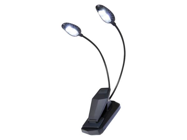 Doppia lampade a LED con bracci flessibili che consentono di dirigere la luce proprio dove serve. Alimentabile a batterie, con un caricabatterie standard USB o tramite l'alimentazione USB di un computer. Puoi illuminare in modo adeguato gli spartiti con questa comoda luce a LED clip-on, che si inserisce nel case dello strumento o nella tua borsa degli accessori.