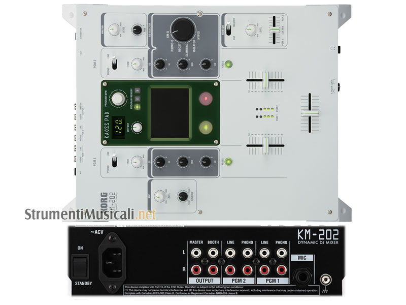 KM (acronimo di Kaoss Mixer) è la sigla identificativa della nuova linea di mixer digitali per DJ a 24-bit prodotta dalla Korg. Due sono i modelli appartenenti a questa famiglia: il 2 canali KM-202 e il 4 canali KM-402. Entrambi i mixer sono dotati di un multieffetto Kaoss Pad integrato, di un crossfader con curva di dissolvenza configurabile dall'utente e di un sistema di equalizzazione che permette 6 differenti modalità operative. Sappiamo come la manipolazione artistica delle frequenze sia ormai un chiodo fisso del DJ e per questo motivo Korg ha sfruttato il suo know-how nel campo della sintesi sonora per fornire al DJ la possibilità di variare in base alle esigenze del momento la modalità operativa dell'eq: dal filtro passa alto a quello passa basse, fino alle particolari curve "Hyped" e "Isolator". Ogni canale dispone di tre potenziometri rotativi (alti, medi e bassi) che rispondono in modo diverso in base all'impostazione della curva dell'eq effettuabile da un selettore a 6 posizioni. Grazie a questo equalizzatore particolare e al multieffetto Kaoss Pad integrato questi mixer a 2 e 4 canali consentiranno al DJ di usufruire di effetti professionali senza per forza ricorrere ad unità esterne con i relativi spesso scomodi collegamenti. Un'ottima soluzione quindi per quei DJ che hanno la propria consolle allestita in un flight case. Il Kaoss Pad integrato (attivabile sui canali mediante l'apposito tasto "KAOSS") fornisce più di 30 effetti, tutti controllabili con la punta delle dita come da tradizione KAOSS PAD. Un tasto "PROGRAM MEMORY" permette il salvataggio e il richiamo immediato delle impostazioni, mentre la funzione "FX RELEASE" aggiunge delay e riverbero nel momento in cui passi da un effetto all'altro. Tra gli effetti disponibili troviamo: vari filtri, delay, riverberi, real-time looper e una sezione di suoni di synth.