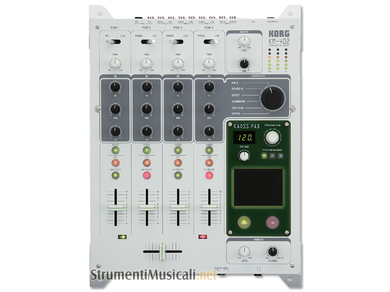 KM (acronimo di Kaoss Mixer) è la sigla identificativa della nuova linea di mixer digitali per DJ a 24-bit prodotta dalla Korg. Due sono i modelli appartenenti a questa famiglia: il 2 canali KM-202 e il 4 canali KM-402. Entrambi i mixer sono dotati di un multieffetto Kaoss Pad integrato, di un crossfader con curva di dissolvenza configurabile dall'utente e di un sistema di equalizzazione che permette 6 differenti modalità operative. Sappiamo come la manipolazione artistica delle frequenze sia ormai un chiodo fisso del DJ e per questo motivo Korg ha sfruttato il suo know-how nel campo della sintesi sonora per fornire al DJ la possibilità di variare in base alle esigenze del momento la modalità operativa dell'eq: dal filtro passa alto a quello passa basse, fino alle particolari curve "Hyped" e "Isolator". Ogni canale dispone di tre potenziometri rotativi (alti, medi e bassi) che rispondono in modo diverso in base all'impostazione della curva dell'eq effettuabile da un selettore a 6 posizioni. Grazie a questo equalizzatore particolare e al multieffetto Kaoss Pad integrato questi mixer a 2 e 4 canali consentiranno al DJ di usufruire di effetti professionali senza per forza ricorrere ad unità esterne con i relativi spesso scomodi collegamenti. Un'ottima soluzione quindi per quei DJ che hanno la propria consolle allestita in un flight case. Il Kaoss Pad integrato (attivabile sui canali mediante l'apposito tasto "KAOSS") fornisce più di 30 effetti, tutti controllabili con la punta delle dita come da tradizione KAOSS PAD. Un tasto "PROGRAM MEMORY" permette il salvataggio e il richiamo immediato delle impostazioni, mentre la funzione "FX RELEASE" aggiunge delay e riverbero nel momento in cui passi da un effetto all'altro. Tra gli effetti disponibili troviamo: vari filtri, delay, riverberi, real-time looper e una sezione di suoni di synth.