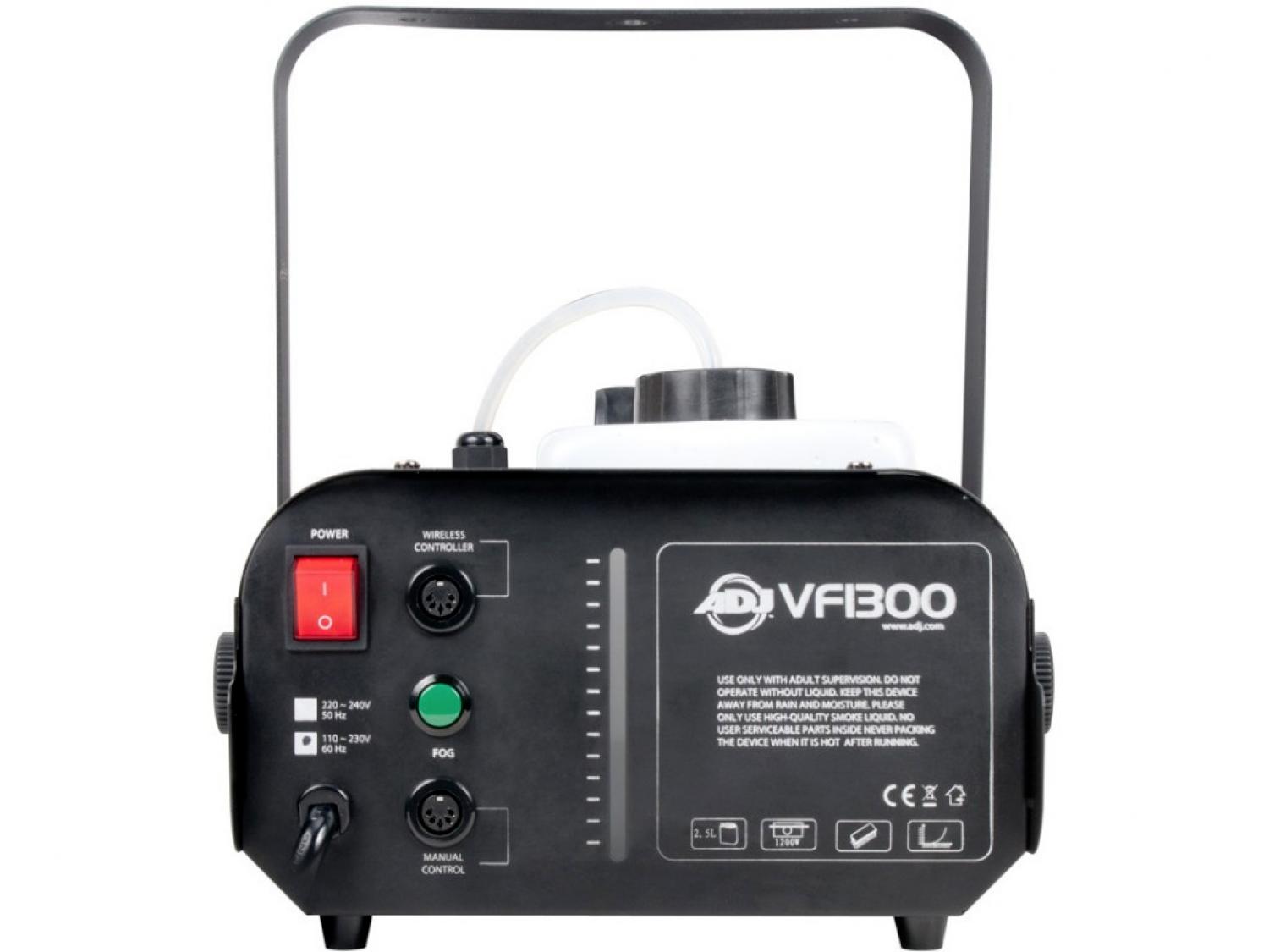 ADJ VF1300 è una macchina del fumo da 1300W ideale per locali e bar di medie dimensioni che desiderano dare un'atmosfera speciale ai loro eventi, e mettere in risalto i giochi di luce. La VF1300 è dotata di una caldaia ad alta efficienza, un serbatoio esterno da 2,3 litri, indicatore di livello del liquido del fumo, comando a distanza a filo ed un telecomando senza fili, ed utilizza un liquido del fumo a base acqua. Altre caratteristiche avanzate includono l'Electronic Thermo Sensing (ETS) per il controllo ottimale della caldaia ed un sensore di livello liquido a protezione della pompa. Il telecomando timer-remote è disponibile separatamente.