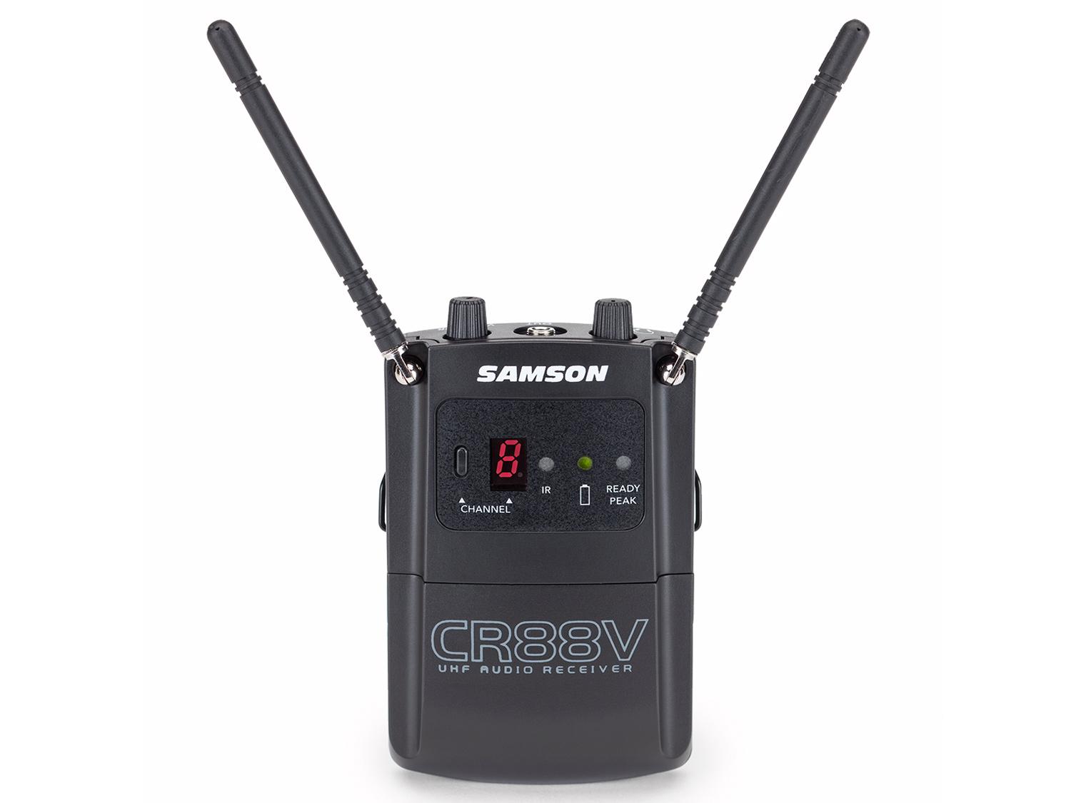 Il Samson Concert 88 Camera è un sistema wireless UHF professionale che porta una qualità audio eccezionale per film e produzioni video. Con 16 frequenze selezionabili per un funzionamento privo di interferenze ed un ricevitore montabile su macchina fotografica alimentato da una batteria ricaricabile estraibile, il Concert 88 Camera offre prestazioni affidabili ed una installazione efficiente. Per la massima comodità d'uso, il Samson Concert 88 Camera offre 12 ore di autonomia con una singola batteria agli ioni di litio rimovibile e ricaricabile (due incluse). Un indicatore del livello della carica consente di sapere quando è il momento di sostituirle. Il caricabatteria esterno in dotazione dispone di un ingresso USB per una maggiore compatibilità. Con una portata wireless "best-in-class" di 90m, il Concert 88 Camera funziona all'interno della banda di frequenza UHF affidabile. Ciò evita interferenze da router wireless ed altri dispositivi portatili. L'audio raggiunge il micro ricevitore CR88V wireless tramite il trasmettitore palmare CH88, che dispone della capsula Q8 Professional Dynamic Microphone di Samson. La batteria ha una durata di otto ore usando due batterie AA (non incluse), il trasmettitore CH88 è dotato di un controllo del Gain variabile, così come un tasto Mute 1-touch popless.