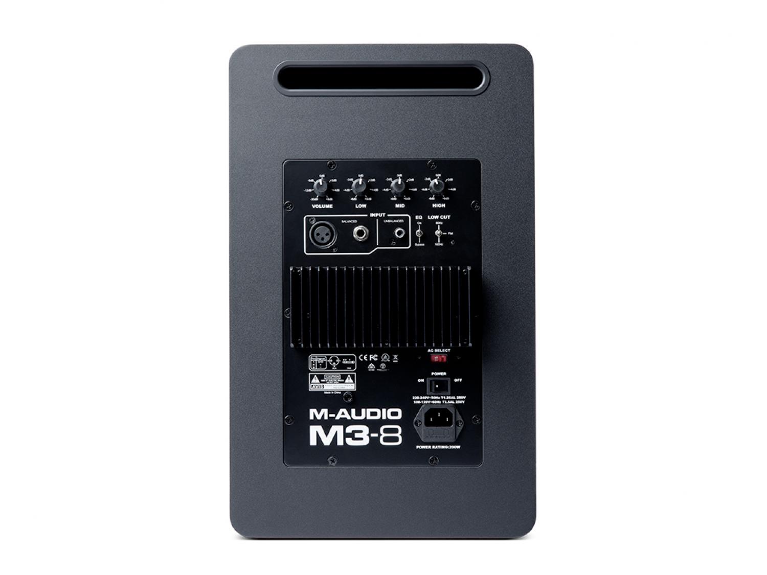 Con i monitor da studio a tre vie M-Audio M3-8 passi ad un ascolto superiore. Con questi eccezionali monitor potrai ascoltare le tue sessioni con maggior accuratezza ed eseguire mix migliori. Il design coassiale altamente efficiente, consente di ottenere una incredibile qualità sonora pur mantenendo le tipiche dimensioni dei monitor a 2 vie. Grazie ai driver per le medie e alte frequenze montati sullo stesso asse il suono viene rilasciato sullo stesso piano focale, migliorando il tempo di allineamento e l'ascolto senza fatica. Il leggero tessuto in kevlar scelto per il driver da 5" e 8" è resistente ed affidabile, mentre il tweeter da 1" in seta con tecnologia a guida d'onda offre una maggior chiarezza. Oltre al frontale in legno laccato, il cabinet dei monitor M3-8 dispone di pot posteriore per le basse frequenze di adeguate dimensioni, e rinforzi interni ottimizzati. I 200W di potenza erogata sono l'ideale per l'utilizzo di M3-8 in ambienti di grandi dimensioni, mentre il crossover finemente regolato, consente una risposta in frequenza lineare lungo tutto lo spettro. L'equalizzatore a tre bande e il filtro low-cut posti sul pannello posteriore, consentono di regolare il suono dei monitor in relazione all'acustica dell'ambiente in cui vengono posizionati.