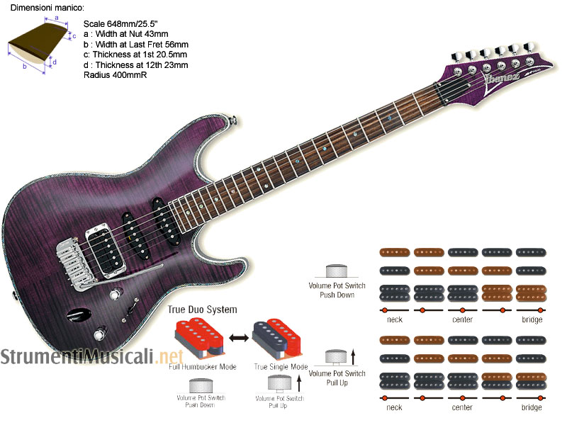 • Single coil AHS1 (manico) + single coil AHS2 (centro) + humbucker IBZ True Duo Bucker (ponte)