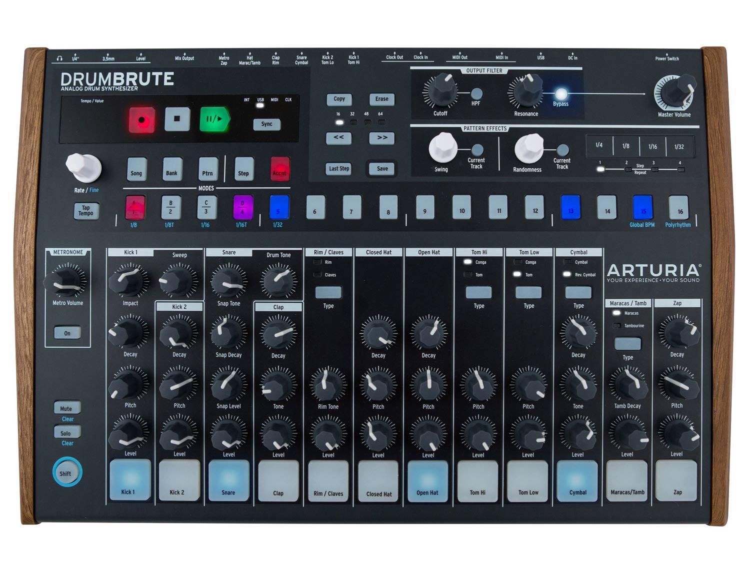 DrumBrute è una drum machine all-in-one analogica progettata con prestazioni e editing approfonditi dell'audio nel suo cuore. Dai alla tua musica l'impatto analogico che si merita! Fornisce 17 diverse batterie e strumenti a percussione completamente analogici, con un sequencer intuitivo, connettività massiccia, filtro a due modalità Steiner-Parker, e controlli dinamici delle preformance, DrumBrute porterà la tua produzione beat ad un livello superiore. Creare drum beat energici ed emozionanti con un unico dispositivo facile da usare. Con il suo vasto potenziale sonoro ed un flusso di lavoro dolce, DrumBrute soddisfa e supera le aspettative dei musicisti più esigenti. Colma il divario tra ispirazione e tecnologia, DrumBrute offre suoni di batteria analogici incisivi, avanzate possibilità di sequencing 64 step / 64 pattern e controlli delle performance ultra-efficaci. Ciascuna delle diciassette parti di Percussioni e Batterie è analogica al 100%, e porta il DNA selvaggio della famiglia Brute Synth. DrumBrute è interamente polifonico, in modo che tutti i suoi suoni possano essere suonate contemporaneamente e contorto dal filtro 12dB Steiner-Parkerdai a due modalità. Una collezione di 17 diversi strumenti drum analogico; un avanzato drum sequencer a 64 step con modalità song; una glitch machine poliritmica, step-repeat; una concentrato di performance ed un sequence looper. DrumBrute è tutto questo. Può anche funzionare come hub creativo, dato che la sua ampia connettività consente di indirizzare separatamente diverse sezioni del mix, e si connette a tutti gli strumenti da studio e live esistenti con USB, MIDI e Clock I/O.