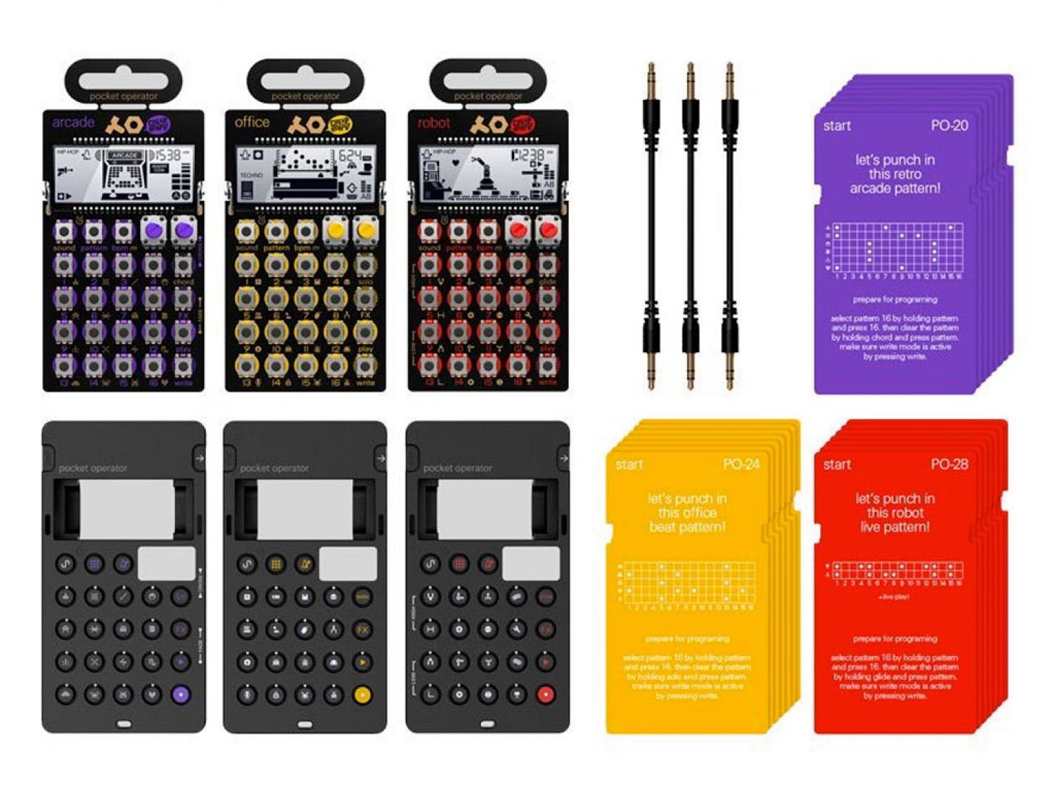 Il Super Set di Teenage Engineering è formato da PO-20, PO-24, PO-28, 3 pro case, 3 sync cable più le pattern card. Il PO-20 Arcade è un sintetizzatore di melodie e sequencer con blocco dei parametri, effetti punch-in, stili di arpeggio e accordi, il PO-24 Office è una drum machine e noise sequencer con blocco dei parametri, funzionalità solo ed effetti di punch-in; il PO-28 Robot è un motore synth 8-bit in stile retro che consente di modellare e creare i suoni, con 15 preset per guidarti sulla giusta carreggiata. Tutti i modelli Pocket Operator si completano perfettamente a vicenda. Da drum machine, sintetizzatori di basso e lead a noise percussion, le sei unità singole consentono di creare una band tascabile. Utilizzali separatamente o collegali insieme, la scelta è tua.