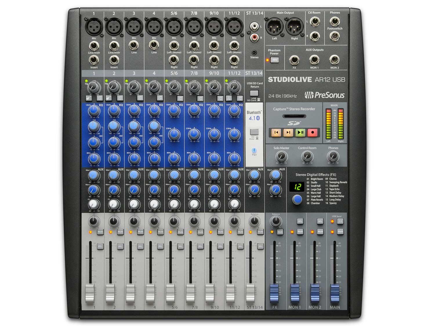 StudioLive AR12 USB è equipaggiato con tutte le connessioni necessarie a mixare e registrare live, in studio o durante sessioni di prova. Ciascuno dei 4 canali mono e dei 4 canali stereo comprende fader da 60mm per il controllo di volume, ingresso microfonico con preamp in Classe A, EQ a 3 bande. Sono anche disponibili 2 Insert (canali 1 e 2) per utilizzare effettistica esterna. Oltre alle uscite principali, dispone di 2 uscite monitor, ciascuna con bus dedicato, per gli ascolti sul palco e un amp per cuffie o in-ear system. Inoltre essendo anche un mixer da studio, StudioLive AR12 USB è provvisto di uscite control-room con controllo di volume per i tuoi ascolti in studio. Ciascuno dei 4 canali mono è equipaggiato di connettore XLR con preamp microfonico in Classe A, ingresso di linea, filtro passa-basso, mute, pan e solo con ascolto prefader. I canali stereo (dal 5 al 12) hanno le stesse caratteristiche, ma con ingressi di linea left e right ed un ingresso microfonico solo sui canali dispari. Con questa dotazione puoi collegare microfoni, tastiere e tanto altro con gli stessi controlli disponibili sui mixer più grandi. L'alimentazione Phantom può esere abilitata per usare microfoni a condensatore oppure spenta se si utilizzano microfoni dinamici. Tutti i canali sono provvisti di EQ semi-parametrico a 3 bande per un controllo preciso della timbrica di ogni strumento. Durante l'utilizzo potrai apprezzare la varietà delle connessioni di StudioLive AR e scoprirai che questo mixer gestisce praticamente qualsiasi segnale da qualsiasi fonte audio.
