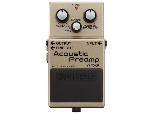 Con l'AD-2 Acoustic Preamp, i chitarristi acustici possono ora sperimentare un suono naturale in qualsiasi momento dell'esecuzione. Dotato di un motore audio BOSS avanzata, questo pedale compatto racchiude una sofisticata potenza di elaborazione che smentisce le sue piccole dimensioni e la semplice interfaccia intuitiva. L'Acoustic Resonance riproduce le complesse caratteristiche di risonanza dello strumento scollegato, mentre Ambience fornisce un riverbero di livello professionale perfettamente ottimizzato per la chitarra acustica. L'AD-2 dispone anche di strumenti essenziali sul palco come un filtro notch per il controllo del feedback, una DI bilanciata per il collegamento diretto ad una PA, e una comoda funzione mute per l'accordatura e lo switch delle chitarre.