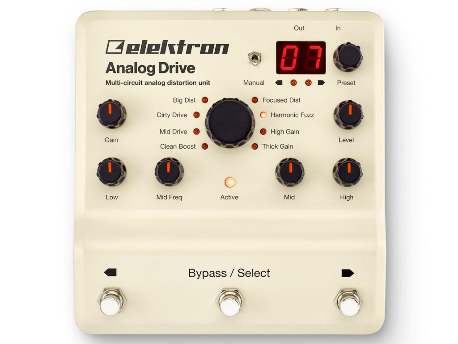 Analog Drive mette a disposizione otto tipi di distorsione analogica in un unico apparecchio. E' il pedale ideale per i chitarristi che vogliono stravolgere il suono nel modo più creativo possibile. Con otto differenti circuiti di distorsione analogica, Analog Drive offre una varietà sonora senza precedenti: un unico stomp box con un solido telaio e possibilità di modellazione del suono pressoché infinite. Migliora il tuo amplificatore con l’equalizzatore analogico a 3 bande. I medi con frequenza regolabile sono ciò che serve per ottenere un'equalizzazione perfetta. La possibilità di controllare la banda media con un pedale di espressione, consente di ricreare facilmente effetti di tipo wah. La possibilità di memorizzare i propri preset ne facilita l'utilizzo nei concerti live. I parametri di Analog Drive sono tutti controllabili via MIDI, e include la possibilità di inviare messaggi di program change.