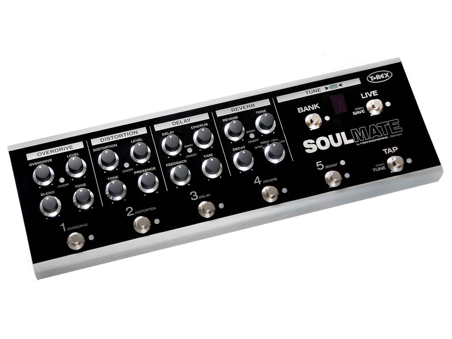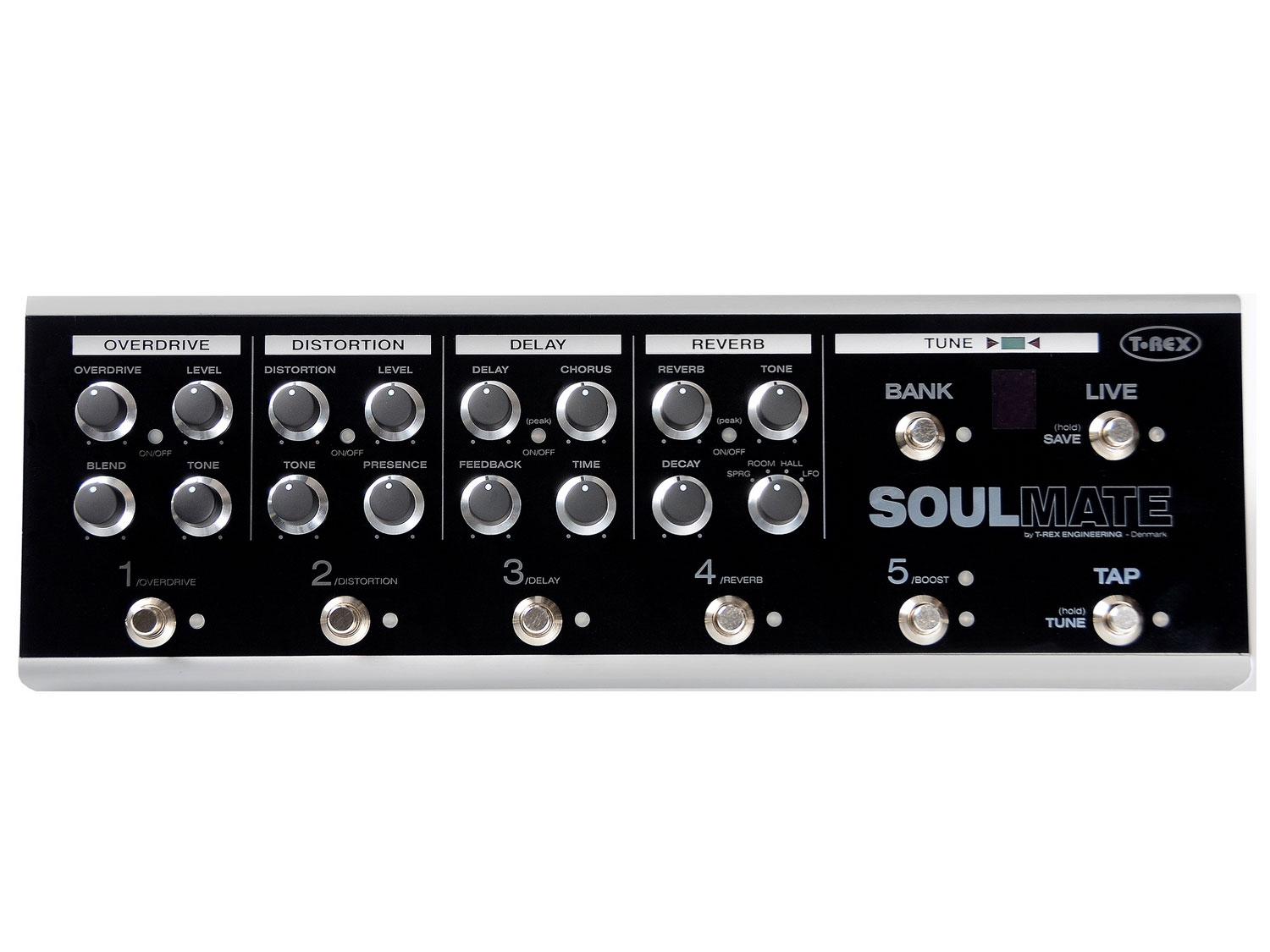 Il SoulMate unisce 5 pedali, un accordatore ed un sistema di switch integrato in uno. Gli effetti inclusi ti daranno tutto i suoni fondamentali di cui hai bisogno, ed anche alcuni che ti faranno sentire come a casa quando inizi ad esplorare i suoni. Il SoulMate può essere utilizzato come se fossero 5 pedali super-incollati insieme, ma c'è di più - il sistema di commutazione integrato permetterà di attivare una qualsiasi combinazione di effetti con la singola pressione su un pedale. Gli effetti sono versioni modificate di alcuni dei pedali più popolari di T-Rex, e sono stati attentamente progettati per funzionare insieme. Sono stati anche aggiornati numerosi componenti nel percorso del segnale per un suono più pieno, più grande, e il segnale dry è mantenuto analogico fino in fondo.