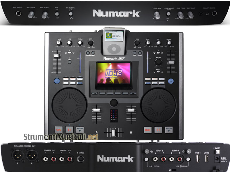 L'iDJ2 della Numark è un prodotto unico e innovativo che permette di sfruttare un solo lettore iPod come sorgente di brani per i due controller integrati; l'unica console di mixaggio per iPod e memorie di massa USB dotata di scratch, pitch, loop, cue e calcolo dei BPM (Beatkeeper™ e Tap tempo). iDJ2 consente quindi al DJ di riprodurre 2 brani simultaneamente, ognuno dei quali potrà essere soggetto alle funzioni di editing real-time (come pitch, ecc.) di cui questa console Numark dispone. Grazie alla presenza di 2 porte USB collocate nel retro dell'apparecchio, l'utente potrà usufruire di eventuali sorgenti addizionali per i file audio da riprodurre, come altri iPod, Memory Sticks, oppure Hard Disk USB esterni. Oltre alle porte USB, l'iDJ2 è dotato di ingressi line, phono e microfonico che ne fanno un completo mixer 2 canali, con equalizzatore 3 bande e gain, nel quale il DJ può miscelare sorgenti tradizionali come giradischi e lettori CD insieme ai file audio presenti sulle unità di storaggio precedentemente citate. L'uso e la gestione dei brani è estremamente semplificato dall'interfaccia utente intuitiva, facente perno sul largo display LCD che mostra la forma d'onda e il profilo della traccia. Altra caratteristica importante in aggiunta alle complete funzioni di controllo audio dell'IDJ2 è la possibilità di registrare le proprie performance su iPod, o su drive USB esterni. iDJ2 è una console di mixaggio e un sistema portatile per DJ, perfetto per i "podcasting". iDJ2 ricarica la batteria dell'iPod connesso nello slot e supporta i file audio MP3, Ogg Vorbis e ACC (non protetti).