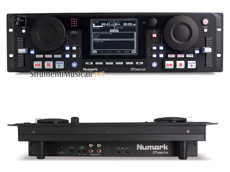 Il Numark D2Director è uno strumento dalle dimensioni di 3 unità rack dotato di un ampio display LCD accoppiato ad una rivoluzionaria interfaccia utente. Il design in pieno stile "plug and play" dello strumento fa si che l'utente possa ricercare, riprodurre e controllare file audio musicali da una qualsiasi memoria di massa USB. Le canzoni presenti sulle memorie di massa connesse al D2 Director vengono indirizzate automaticamente alle due unità di controllo incorporate nello strumento, entrambe equipaggiate di una larga manopola per l'impostazione del Cue e lo scratch, dei vari tasti di trasporto e il fader del pitch control, che permettono di lavorare in modo tradizionale, come se stessimo utilizzando un tradizionale lettore CD per DJ. L'ampio display LCD mostra la forma d'onda e le proprietà della traccia riprodotta aggiornate in tempo reale. I 6 pulsanti collocati in prossimità del display servono per controllare funzioni quali effetti, gestione delle memorie di massa e dei file musicali. D2 Director monta 3 porte USB, una posizionata sulla sinistra del pannello frontale e le restanti due nel retro. La presenza delle porte USB serve per collegare all'unità di controllo le numerose memorie di massa con le quali questa è compatibile: iPod, Memory Stick™ media, Hard disk USB, ecc.. Il DJ potrà inoltre collegare una tastiera USB per semplificare ulteriormente le operazioni di ricerca delle song. D2 Director dispone delle due uscite stereo line in formato RCA (una per ciascun player/controller). D2 Director supporta i file audio MP3, Ogg Vorbis e ACC (non protetti). Tra le funzioni professionali di cui il D2 Director è capace segnaliamo: pitch control (+/-100%), Key Lock (Master tempo), scratch, seamless loop, smart loop, 2 hot Start Stutter, calcolo dei BPM (Beatkeeper, Tap). D2 è una soluzione comoda da trasportare e da collegare ad un qualsiasi mixer nei club, nei teatri, nei centri congressi, nelle palestre e nelle abitazioni di ultima generazione.