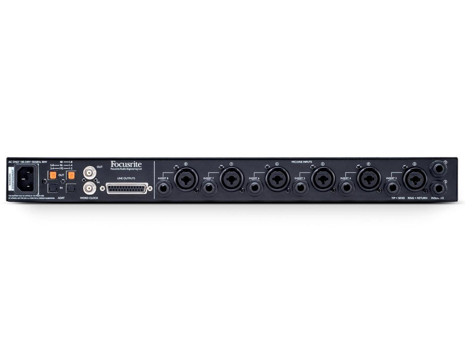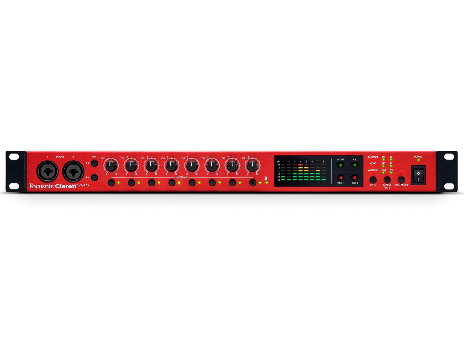 Clarett Octopre è il preamplificatore microfonico a 8 canali di Focusrite con 118dB di gamma dinamica, bassissima rumorosità e conversione di precisione AD/DA a 24bit/192 kHz. I preamplificatori microfonici Clarett progettati specificatamente si caratterizzano per l'effetto "Air" commutabile di Focusrite, che conferisce ai microfoni la spazialità e la nitidezza del preamplificatore microfonico ISA basato su trasformatore. Clarett Octopre dispone inoltre di due ingressi microfonici sul pannello frontale, un insert point su ciascun canale e otto uscite di linea bilanciate che è possibile alimentare direttamente sia dai preamplificatori microfonici, sia dagli ingressi ADAT. Clarett Octopre è ideale per espandere le caratteristiche di un’interfaccia Clarett - o di una qualsiasi interfaccia con ingressi e uscite ottiche ADAT. Clarett Octopre include otto preamplificatori microfonici serie Clarett abilitati "Air" che emula il suono basato sui trasformatori della serie ISA di Focusrite. L'ampia headroom di cui dispongono i preamplificatori li rende ideali per la batteria o altri segnali high-level. La commutazione tra Mic e Line degli ingressi situati sul pannello posteriore avviene automaticamente; inoltre, sul pannello anteriore sono presenti due ingressi Instrument con DI. L’effetto "Air" può essere attivato o disattivato indipendentemente su ciascun canale. È presente anche l’alimentazione phantom, commutabile in due gruppi di quattro canali. La conversione digitale di precisione Focusrite offre un’operatività a 24bit con frequenze di campionamento standard fino a 192kHz e una gamma dinamica di 118dB. Sono disponibili due porte di ingresso ADAT e due uscite, che permettono a Clarett Octopre di trasportare otto canali I/O a frequenze di campionamento fino a 96kHz e quattro canali a 176,4/192kHz.