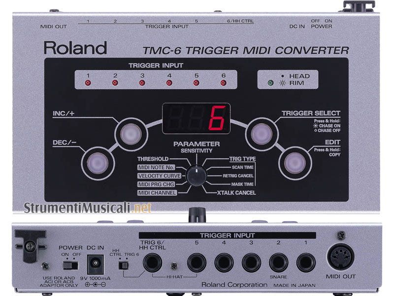 TMC-6 è un'interfaccia che converte un segnale trigger in un segnale midi che verrà poi trasmesso ad un campionatore o ad un modulo sonoro. Si avvale ovviamente della eccezionale tecnologia V-Drum che permette una risposta ai trigger istantanea e accuratissima nelle dinamiche. Possiamo usarlo per triggerare una batteria acustica e avere i suoni del modulo o del campionatore che preferiamo, oppure per ampliare a nostro piacimento il nostro V-Drum set spesso limitato nell'espansione dal numero di trigger input del modulo sonoro. Può essere utilizzato anche in studio di registrazione, collegato ad un registratore multitraccia: avendo tracce separate per i vari suoni di batteria si possono usare questi suoni come segnali trigger per riprodurre i timbri di un generatore sonoro midi o di un campionatore, cambieremo così a nostro piacimento i suoni della batteria che abbiamo già registrato.