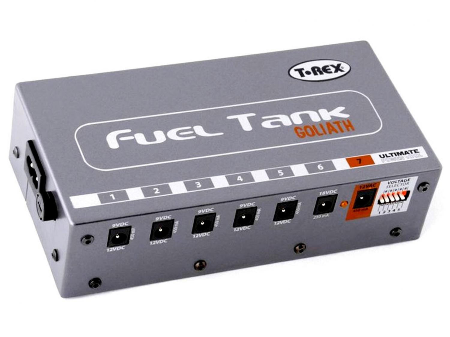 Con sette punti di alimentazione e la capacità di gestire pedali da 9, 12 e 18 Volt CC più un box 12 Volt CA, Goliath alimenterà ogni pedale che possiedi. Ciascuna delle prese standard Goliath trasporta 450mA a 9 o 12 Volt - che sono sufficienti anche per i pedali T-Rex più esigenti. E in più ci sono una presa da 18 Volt CC (250mA) ed una presa di alimentazione da 12 Volt a 450mA.