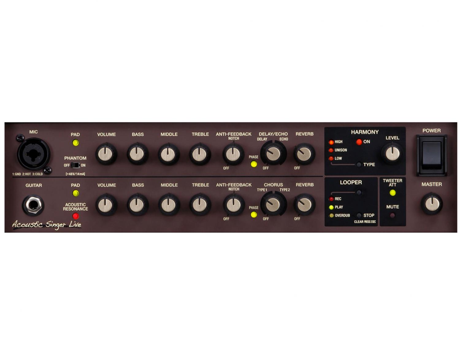 • Canale chitarra dedicato con Acoustic Resonance per ripristinare il suono naturale per mettere in scena chitarre con pickup piezo