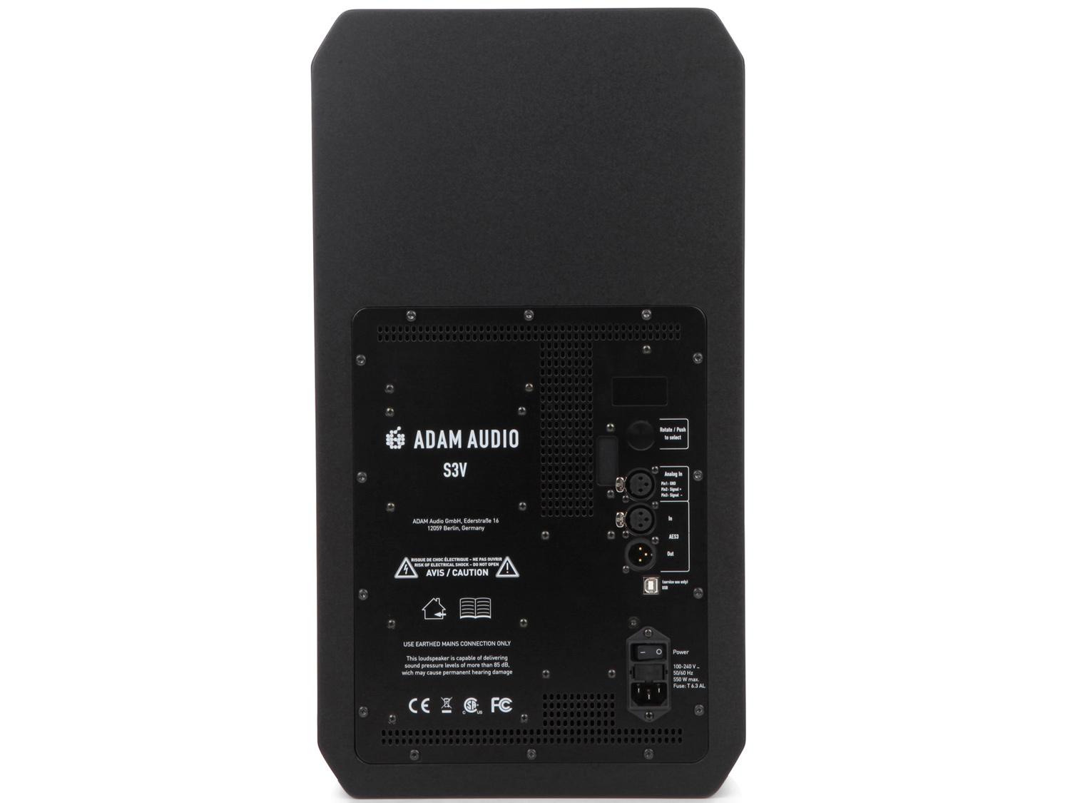 Il S3V è un monitor studio a tre vie ottimizzato per utilizzo verticale e progettato principalmente per applicazioni midfield, anche se può essere utilizzata in ambienti di ascolto più compatti. Le basse frequenze da 32Hz a 250Hz sono gestite da un driver LF completamente nuovo da 9" Extended Linear Excursion (ELE) di ADAM Audio, che incorpora l'altrettanto innovativo Symmetrical Magnet Assembly (SMA) della società ed offre una fascia bassa potente, estremamente accurata, che si estende nella regione sub-bass. Le informazioni Mid-range e HF sono riprodotte con altrettanta precisione analitica grazie alla combinazione di driver mid-range DCH da 4" di nuova concezione ed un driver HF folded-ribbon S-ART estremamente raffinato. Assieme alla nuova guida d'onda HPS, offre una riproduzione delle alte frequenze con uno sweet spot estremamente ampio, con un imaging molto dettagliato ed un suono con un naturale senso di profondità. Il DSP custom-designed della serie S ottimizza i crossover degli altoparlanti per creare risposte lineari nell'intera gamma, oltre a fornire l'equalizzazione utente e le funzioni in room tuning / voicing. Una caratteristica unica del DSP dell'S3V è un preset EQ incorporato che emula la risposta del leggendario monitor S3A di ADAM Audio. Il DSP gestisce anche la protezione del driver ad alta frequenza basata su limiter, elabora i segnali provenienti dagli ingressi digitali dell'AES3, e facilita varie possibilità di espansione nel tempo. Gli aggiornamenti software possono essere eseguiti con facilità tramite la porta USB associata, che consente anche agli utenti di connettere il computer e controllare le funzioni DSP degli altoparlanti tramite un front-end software.
