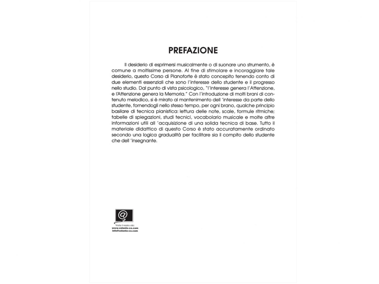 Un metodo per pianoforte pensato per stimolare e incoraggiare il desiderio di esprimersi musicalmente e suonare uno strumento, attraverso due elementi essenziali: l'interesse dello studente e il progresso nello studio. L'interesse genera l’attenzione e quest’ultima favorisce la memoria. Con l'introduzione di molti brani di contenuto melodico, questo metodo mira al mantenimento dell'interesse da parte dello studente, fornendogli allo stesso tempo, per ogni brano, qualche principio basilare di tecnica pianistica: lettura delle note, scale, formule ritmiche, tabelle di spiegazioni, studi tecnici, vocabolario musicale e tante altre informazioni utili all'acquisizione di una solida tecnica di base. Tutto il materiale didattico di questo Corso è stato accuratamente ordinato, secondo una logica gradualità per facilitare sia il compito dello studente che dell’insegnante.