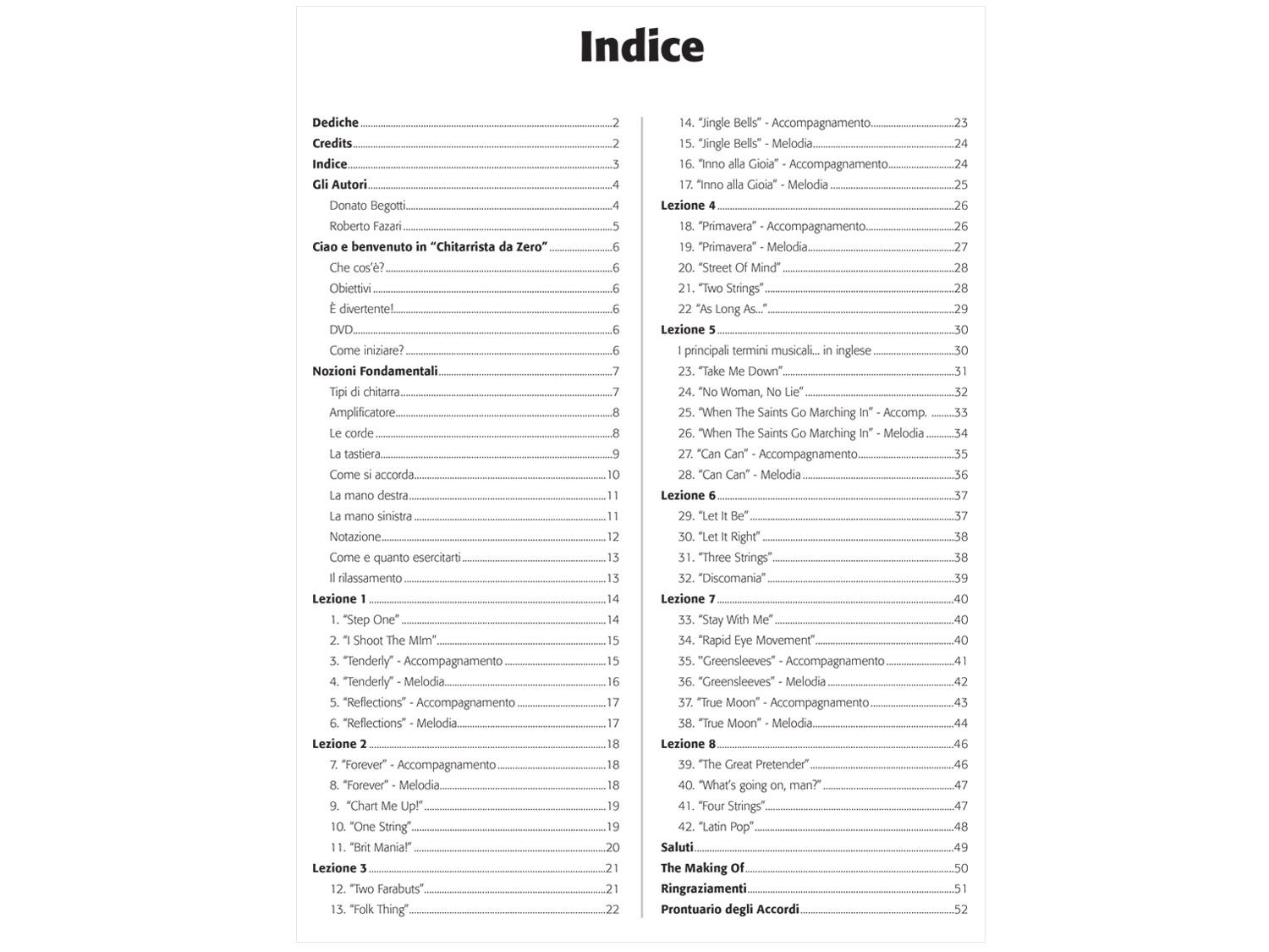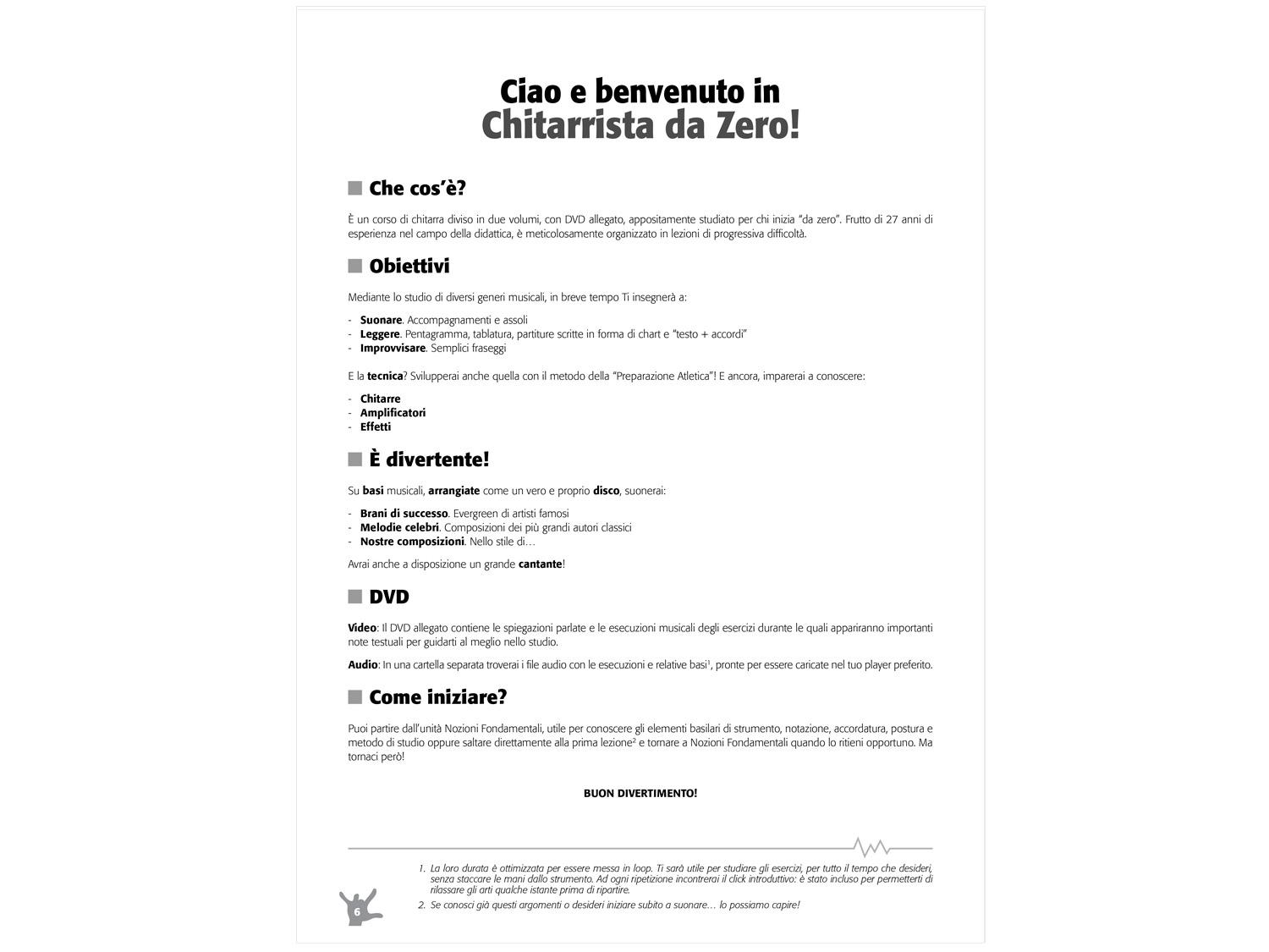 Un corso di chitarra con DVD allegato, appositamente studiato per chi inizia da zero. Frutto di 27 anni di esperienza nel campo della didattica, meticolosamente organizzato in lezioni di difficoltà progressiva. In breve tempo si imparerà a suonare accompagnamenti e assoli, a leggere pentagramma, tablature, partiture scritte in forma di chart e di "testo + accordi", improvvisare semplici fraseggi. Si potrà inoltre sviluppare la tecnica, con il metodo della "Preparazione atletica", e si imparerà a conoscere chitarre, amplificatori, effetti. Ancora, su basi musicali arrangiate come un disco si potranno suonare evergreen, celebri melodie del repertorio classico, composizioni originali degli autori "nello stile di...". Per esercitarsi si avrà anche a disposizione un grande cantante. Il DVD allegato contiene le esecuzioni in video degli esercizi; in una cartella separata, poi, si troveranno i file audio con le esecuzioni e relative basi per studiare, pronte per essere caricate sul proprio player preferito.