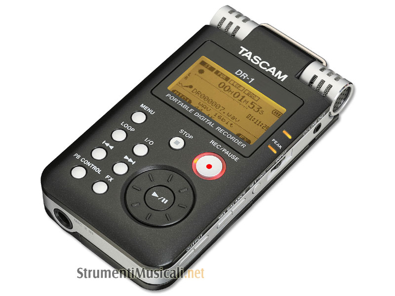The DR-1 is a compact portable stereo digital recorder that captures hours of music to SD memory media. A pair of built-in variable-angle microphones allows the user to record from almost anywhere at MP3 or WAV file formats. Two microphone inputs are available for an external mono or stereo mic. The recorder includes auto gain control and analogue limiting for easy setup and a switchable low-frequency filter to eliminate handling or wind noise. One out of eleven effects can be applied to the input signal during recording. Recordings can also be added to existing audio files (overdub feature). And a host of playback features is supplied, including pitch and key control, a cancelling function as well as a tuner and a metronome. The DR-1 comes with a 2-Gigabyte SD card and a lithium-ion rechargeable battery for many hours of recording time. An AC adapter is available as an option.