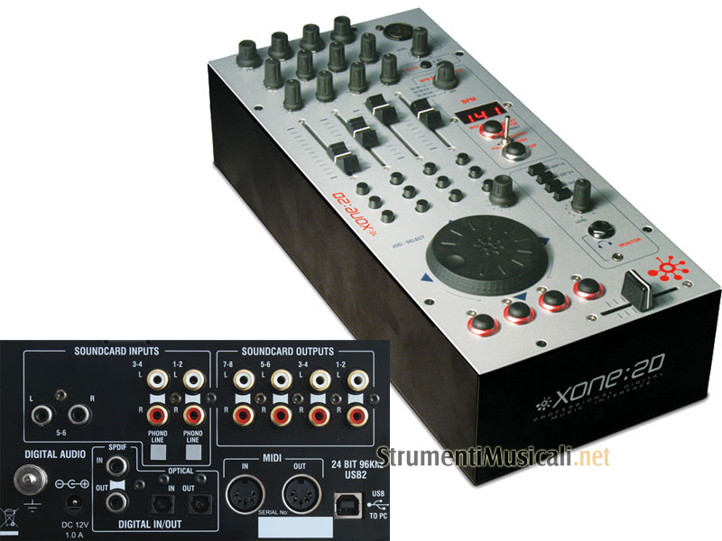 Xone:2D nella sua versione definitiva è molto più completo e potente della versione annunciata. Xone:2D è la combinazione di una scheda audio USB 2.0 a 9 canali stereo con un controller MIDI, che ciascun DJ può collegare al proprio mixer od utilizzare stand alone nel set-up dei più moderni DJ software La scheda audio USB 2.0 a 96kHz 24-bit è di altissima qualità. La grande scelta di connessioni consente la massima integrazione in qualsiasi sistema. Il contatore BPM con display a LED del 3D è integrato, con la possibilità di rilevare automaticamente la velocità metronomica del segnale presente in ingresso. E' anche presente un generatore di MIDI clock, regolabile dal tasto 'tap tempo', o sincronizzabile al beat del BPM counter; per avere tutte le performance di sincronizzazione MIDI del 3D. Il controller MIDI funziona attraverso l'USB, ma è anche dotato di un connettore DIN standard a 5 pin per la connessione di dispositivi esterni al computer. La grande dotazione di controlli comprende: 4 fader da 60mm, crossfader, 8 potenziometri con tacca centrale, 20 tasti, di cui 4 illuminati, 4 encoder rotativi con pulsante ed un jog multifunzione con 4 tasti integrati. Tutti i controlli sono universali e sono 'mappabili' in qualsiasi software MIDI compatibile. E' inoltre presente l'uscita cuffia con relativa sezione monitor, uno dei canali di ingresso può essere configurato come microfonico. Staffe dedicate opzionali consentono il collegamento fisico con i mixer della linea Xone, e sono disponibili mascherine per i tasti relative ai software Ableton Live e Traktor DJ Studio