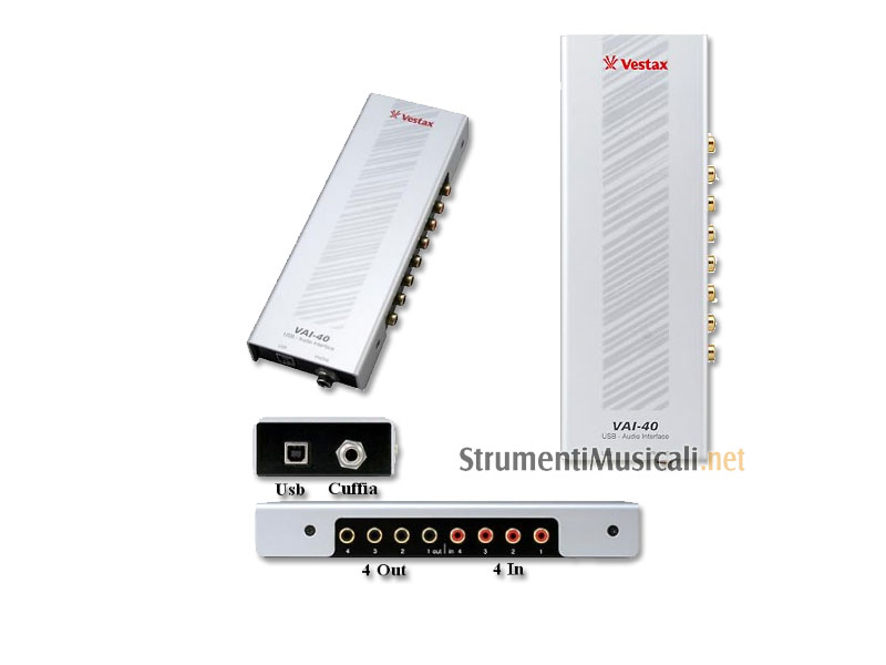 VAI-40 è una potente quanto economica soluzione audio USB, per il remix tramite computer, una soluzione perfetta per performance dal vivo con il controller VCI-100 USB. Oltre alle funzionalità standard di registrazione riproduzione, il VAI40 offre tutto il necessario per la produzione musicale professionale. Nel suo contenitore compatto il VAI 40 fornisce 4 ingressi analogici (2 canali stereo) e 4 uscite analogiche (2 canali stereo) con connettori RCA e un'uscita stereo per cuffia.Grazie al supporto dei driver ASIO 2.0, CoreAudio e MME / WDM, il VAI-40 è compatibile con tutti i più diffusi software come Cubase, Logic, Sonar, Reason, Reaktor, MixVibes, Traktor DJ, Studio,LIVE6, BPM Studio e molti altri.