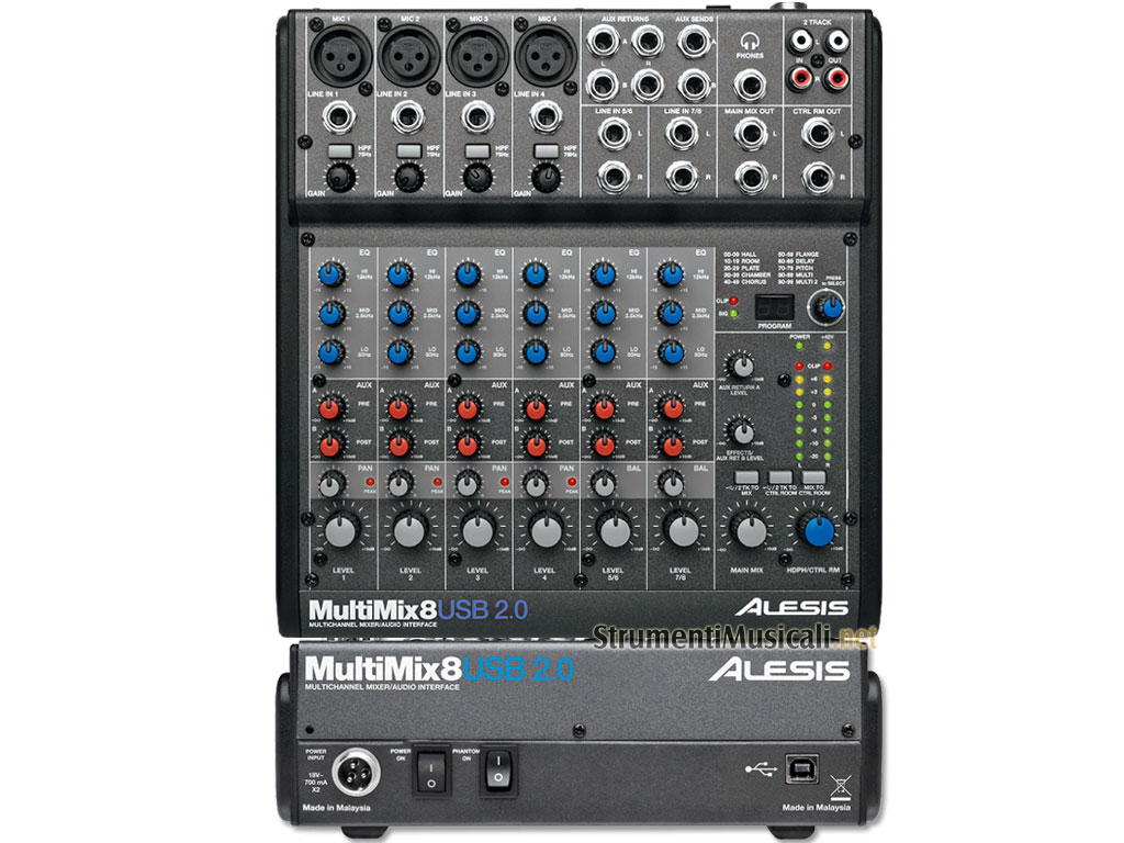 Alesis MultiMix 8 USB 2.0 offre una tecnologia USB 2.0 per registrazioni multicanale ultra-veloci a bassa latenza, 24bit / 44.1-96kHz (con conversione A/D e D/A di fascia alta) direttamente sul tuo computer. Progettato con elettronica analogica a basso rumore, il mixer MultiMix 8 USB 2.0 consente agli utenti di usufruire di 100 effetti a 28-bit con una qualità da studio digitale. Il MultiMix 8 USB 2.0 è fornito anche del premiato software Cubase LE in bundle.