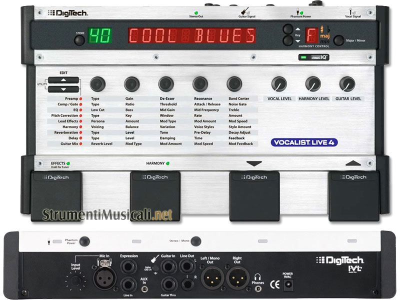 • Built-in mixer with Vocal, Harmony and Guitar level controls