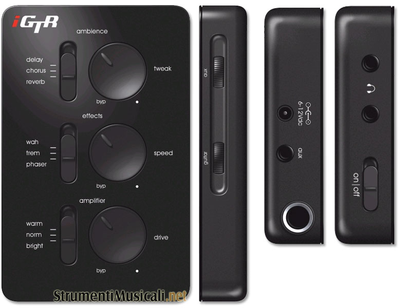 Tascabile e autoalimentato, iGTR vi dà il suono di un vero amplificatore con effetti, sempre e ovunque. Agganciatelo alla cintura, inserite il jack della vostra chitarra e siete già pronti per suonare. Collegate le cuffie o degli speaker all'uscita audio e godetevi la potenza di iGTR: fantastici timbri di chitarra - dalle sonorità clean più taglienti ai suoni distorti di grande impatto - sotto la punta delle vostre dita..