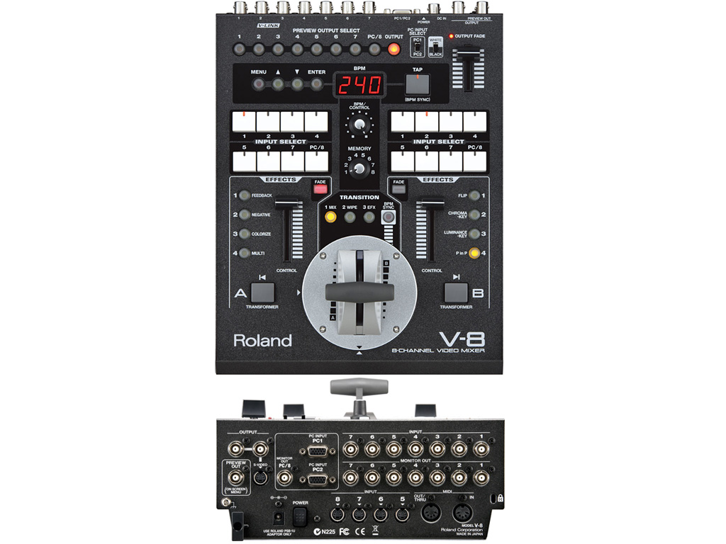 EDIROL annuncia l'uscita di V-8, mixer video compatto sulla scia del successo internazionale dello standard V-4... EDIROL V-4 è diventato uno standard nell'industria nel mondo dei mixer video. Ora EDIROL è decisa ad espandere ulteriormente questo successo con il nuovissimo mixer V-8. Nuovo standard di mixaggio EDIROL V-8 si sviluppa sulle potenzialità del V-4 offrendo però un totale di 8 input video, includendo ingressi switchabili su RGB con scan converter incluso. Utilizzando l'ingresso RGB il V-8 è a tutti gli effetti un progetto a 3 buss, con 2 canali TBC/frame sync e, per la prima volta, un mixer EDIROL con tali caratteristiche viene offerto ad un prezzo così conveniente. Il V-8 si contraddistingue per i suoi controlli fisici ergonomici che evidenziano la facilità di utilizzo pur mantenendo un design robusto e facilmente trasportabile. Il V-8 incorpora un numero di nuovi effetti in real-time aggiornando il pallet originale di effetti presenti sul V-4. Il V-8 implementa inoltre il V-LINK, sistema che permette performance in tempo reale controllando e interfacciandosi con altre apparecchiature MIDI, garantendo così il massimo in termini di espressione creativa. Con le stesse semplici operazioni del V-4 più una serie aggiuntiva di effetti, V-8 mira a diventare un nuovo standard tra i mixer video, offrendo funzioni e caratteristiche senza precedenti in questa fascia di prezzo. V-8 sarà disponibile da fine Aprile 2008