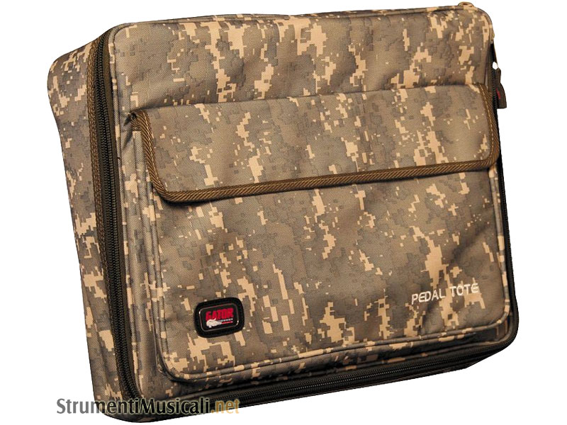 The Gator GPT-Camo Pedal Tote Pedalboard features a 16.5" x 12" tolex covered plywood pedalboard with a carry handle. The face of the pedalboard is covered with Velcro for attaching pedals and has access holes for cables to run below it to use the 4 supplied mounting screws for most multi-output power supplies. The board slides into a 600-denier nylon padded carrying case with an exterior pocket for cables. Attachment Velcro included.