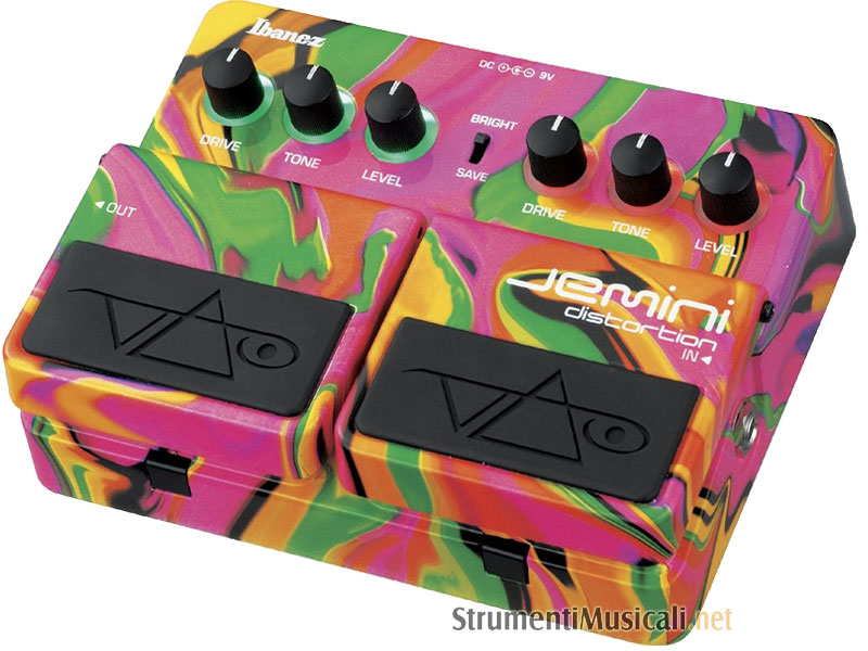 Il pedale distorstore-overdrive Gemini firmato da Steve Vai, racchiude distorsione e overdrive in un'unico pedale. Dotato di una case in alluminio multicolore con inserti in gomma con il logo di Steve Vai, magnifiche luci a LED intorno alle manopole, è un case unico. Il Jemini è pensato per essere visto altre che ascoltato.