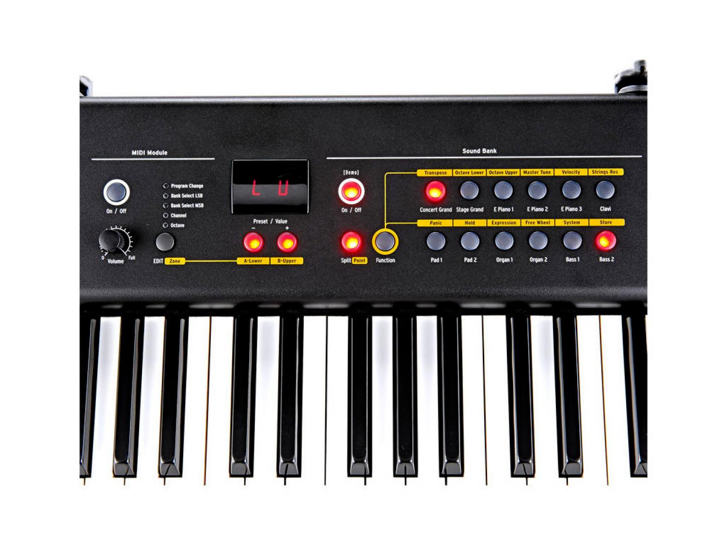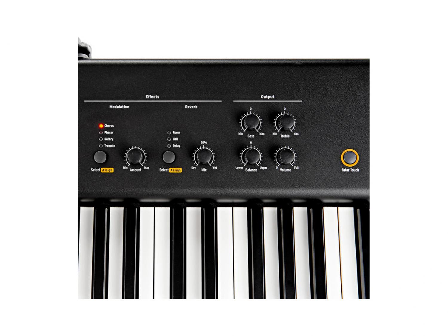 • Panello & Controlli: Pitch Bend Wheel, Free Wheel, controlli MIDI master keyboard, Selezione suoni, controlli effetti, equalizzatore in uscita, display 3 cifre, 50 Preset, Effects Auto-set Panel, 2 zone di tastiera Split/Layer, 4 curve velocity, 1 curva velocity user con 10 memorie "Fatar Touch"