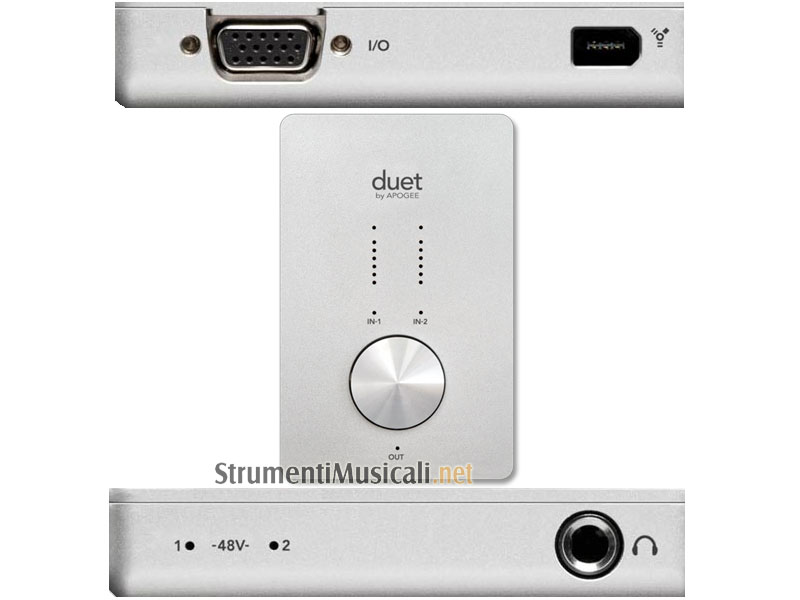 Inspiration is a gift that can come to you anywhere and at anytime. As an artist you need to be prepared. And, you need a collaborator to help you capture it with ease and without compromise... Meet Duet. Duet is a portable audio interface that features the amazing sound quality that made Apogee Electronics famous. With control functions built directly into Apple's Logic Pro, Soundtrack Pro and GarageBand software, Duet empowers you to create professional recordings effortlessly. With Duet, you can plug in guitars, keyboards and microphones and record your music, or simply experience how much better your favorite tracks in iTunes sound. Duet is compact and powered by FireWire, so you can pack up your studio and go anywhere your music takes you.