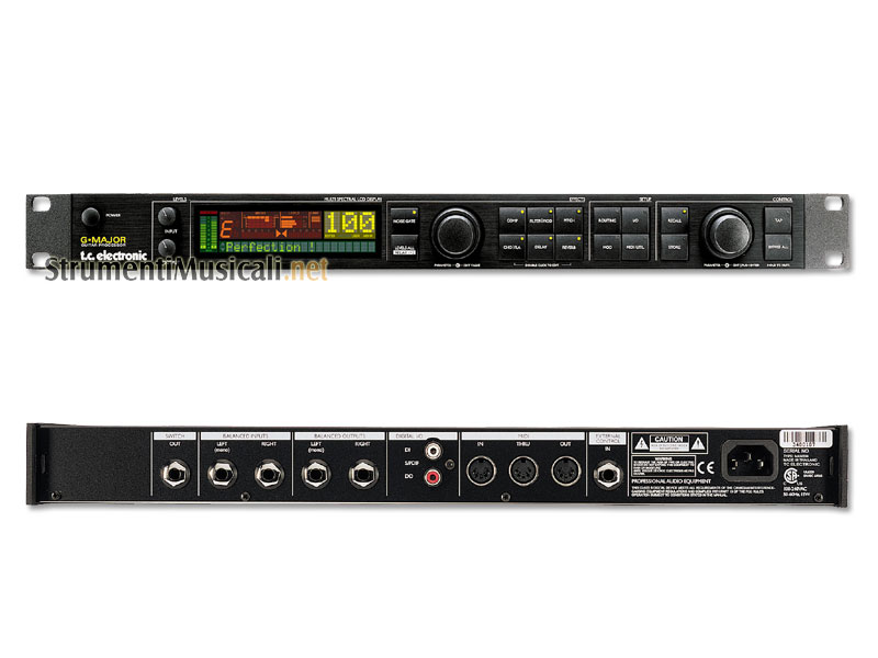 Il Processore Multi-Effetto dal prezzo conveniente per il chitarrista esperto Discendente diretto di G-Force G-Major può beneficiare di tutta l'esperienza e la dedizione che TC Electronic ha sempre rivolto ai processori per chitarra d'elevata qualità. Seguendo le orme di G-Force, G-Major mette a tua disposizione una tecnologia che va oltre le tue aspettative, ad un prezzo sorprendente. Con G-Major potrai usare simultaneamente fino a 8 effetti diversi e un accordatore sempre in linea, con la possibilità di controllo in tempo reale di numerosi parametri, via MIDI o dall'ingresso Pedal. Il cambio dei Presets è veloce e omogeneo, e consente lo "spillover" del Delay. Una miriade d'effetti… Essendo esclusivamente un processore d'effetti, l'uso di G-Major si rivela perfetto in combinazione ad un preamp. Gli effetti sono organizzati in Blocks, ciascuno dei quali contiene vari tipi di effetti da scegliere. Ad esempio, il Delay Block include: Stereo Delay, PingPong Delay, Tap Delay e Dynamic Delay. Sono presenti oltre 25 algoritmi diversi: tira fuori il meglio da ciascuno!