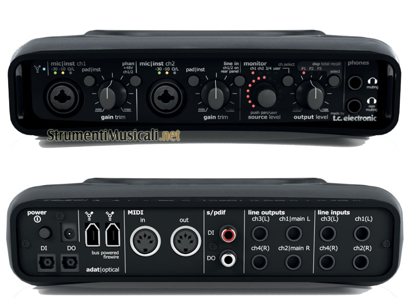 Eccellente interfaccia audio/midi firewire con caratteristiche esclusive per l'utilizzo in situazioni Live, dotata di capacità di routing avanzate, un DSP integrato con numerosi algoritmi di effetti integrati, possibilità di collegare direttamente giradischi con diverse curve di equalizzazione RIAA, potenziometro illuminato per la visualizzazione grafica del livello di vari parametri, etc... Fornito in bundle con Ableton Live Lite 6 TC Electronic Edition !