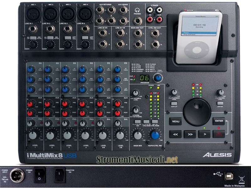 Alesis entra nel mondo Ipod con lo sviluppo di un prodotto che farà la gioia di tutti coloro che vogliono registrare nel lettore mp3 più diffuso al mondo. In pratica si tratta di un normale Multimix 8USB con effetti digitali, con dock e pannello di registrazione per Ipod. L'iMultimix 8USB è l'unico prodotto al mondo che integra un mixer di qualità professionale, equalizzazione a 3 bande su ogni canale, entrate chitarra/linea e registrazione su supporto Ipod tutto in una soluzione unica ed intuitiva. L'iMultimix 8 USB è la scelta ideale per ogni musicista o studio casalingo che voglia registrare le proprie sessioni in maniera facile ed intuitiva direttamente sul più celebre supporto multimediale in commercio , l'Ipod. Tutte le registrazioni hanno qualità CD (44.1 - 48kHz) e possono facilmente essere trasferite sul computer grazie alla funzione "trasferimento registrazioni ad Itunes". Compatibile sia Macintosh che Windows XP l'iMultimix 8 USB è un prodotto che sicuramente farà parlare si sé.