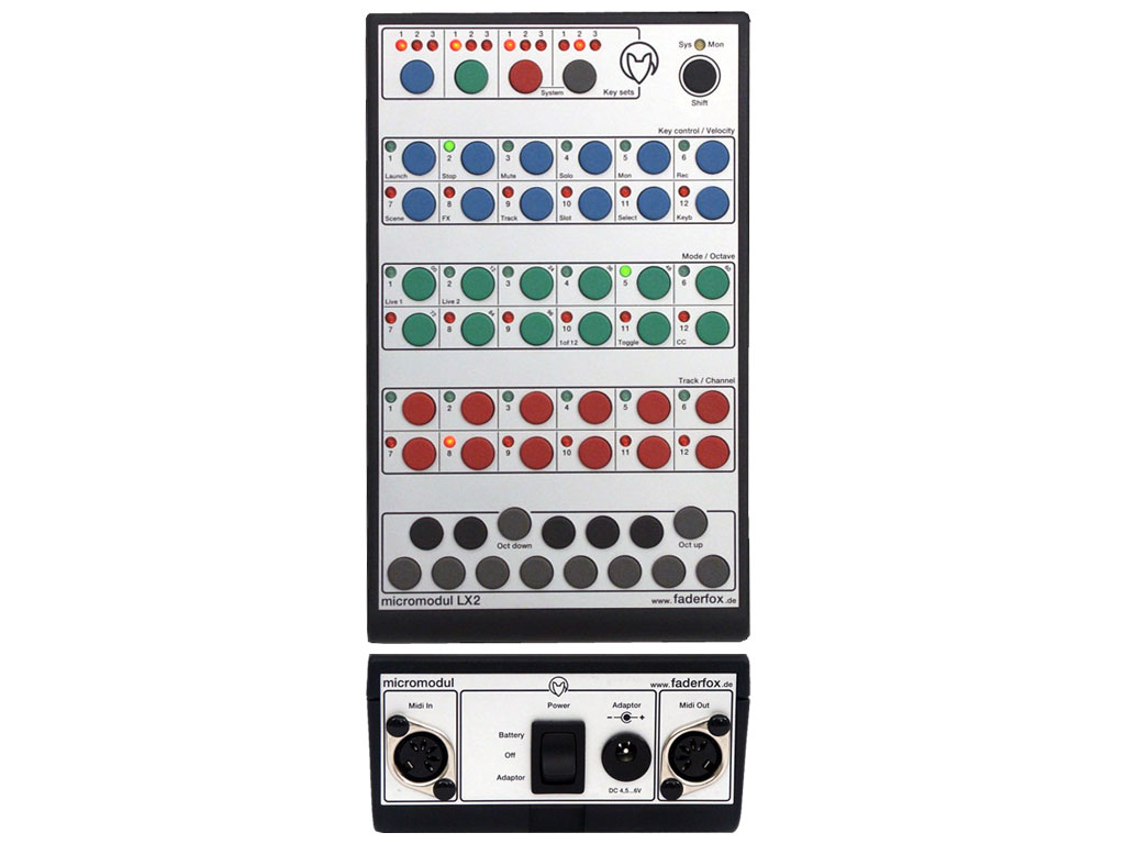 Il Faderfox LX2 è un controller compatto progettato per funzionare perfettamente con Ableton per DJ e live. Il micromodulo LX2 è un Pocket Controller di 2a generazione per l'utilizzo con Ableton Live. E' stato progettato come complemento all'LV2. Mentre l'LV2 offre tutti i fader, encoder ed un joystick, l'LX2 offre tantissime funzioni chiave per il controllo delle tracce, clip, scene ed effetti. Tutto ciò si ottiene con 56 pulsanti e 49 LED. Quattro gruppi di pulsanti sono programmabili in modo indipendente in diverse modalità. Tutte le funzioni di controllo sono immediatamente accessibili per 6 o 12 tracce. Un'altro punto di forza dell'LX2 è la possibilità di attivare oltre 36 slot/scene (fino a 108 utilizzando la funzione keyset).