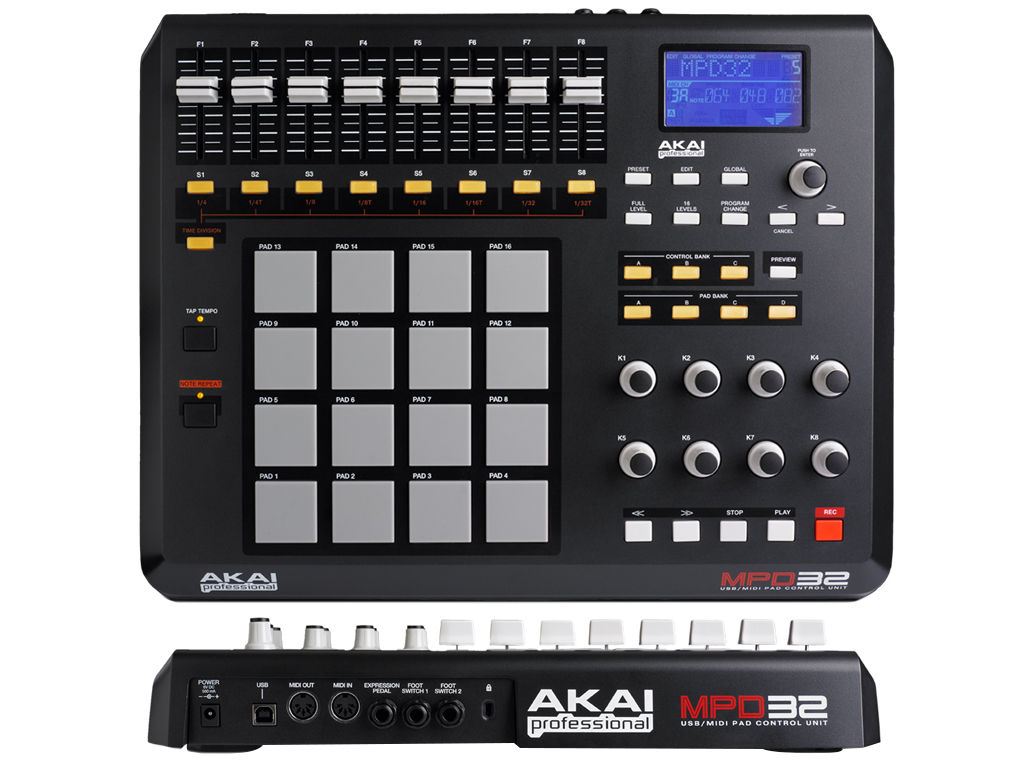 L'AKAI PRO MPD32 è il MIDI Controller USB ideale per DJ, producer e tastieristi. Grazie ai PAD sensibili alla dinamica e alla funzione Note Repeat, la quale permette di creare effetti ritmici (pattern, rullate, ecc.) trasmissibili via MIDI tenendo semplicemente premuti i PAD, l'MPD32 è il MIDI controller perfetto per suonare le parti di batteria nelle tue produzioni. Punto di forza di questo controller è la sezione di controllo, che può contare su 8 pulsanti (CC, PC), 8 fader e 8 potenziometri rotativi a 360° di buona qualità in grado di inviare messaggi di MIDI Control Change. Questi controlli si articolano su 3 distinti layer per un totale di 24 fader e 24 knob. Grazie al particolare layout e alla presenza dei 16 pad da 3x3cm (organizzati su 4 layer, per un totale di 64), l'MPD32 è inoltre un'ottima soluzione per il controllo dei software per l'uso live: come Ableton Live, Reason, Battery, Arkaos, Modul8, ecc.. Importante per l'uso con i sequencer è la presenza dei tasti di trasporto: Forward, Rewind, Stop, Play e Record. A proposito, si segnala la presenza di vari preset per il controllo dei più diffusi software audio/MIDI, oltre che a varie mappature e progetti pre-configurati per avere il tuo software a "portata di mano" grazie ai controlli dell'MPD32. Nelle esibizioni dal vivo tornerà molto utile la funzione (tasto) Tap-tempo e i pulsanti Time-division (1/4, 1/4T, 1/8, 1/8 T, 1/16, 1/16T, 1/32, 1/32T) per sincronizzare in tempo reale la velocità in BPM e la divisione metrica della funzione Note Repeat. Potremo usare l'MPD32 come MIDI Clock Master, oppure impostarlo in Slave per sincronizzare la funzione Note Repeat alla velocità in BPM del nostro software. Compatibile con Windows (XP e Vista) e MacOS, l'MPD32 funziona come interfaccia MIDI USB grazie alle porte MIDI IN & OUT, che consentiranno di interfacciare altri strumenti hardware presenti nel tuo studio con il tuo software audio/MIDI. L'MPD32 è completamente programmabile dall'utente sia da pannello, sia utilizzando l'editor software VyZex in dotazione. Potremo quindi decidere quale tipo di messaggio MIDI, numero di Nota, CC, o PC far inviare ad ogni singolo pad, pulsante, fader o potenziometro. In dotazione viene fornito un progetto di Ableton Live pre-configurato per l'uso in stile DJ, che permetterà all'utente di controllare la riproduzione di loop o tracce audio via pad, e i parametri di volume, solo, cut-off, risonanza e mandata al delay mediante fader e knob. Disponibili anche dei suoni di batteria estrapolati dalla serie MPC e programmati per il lettore di campioni "Impulse" integrato in Ableton. Altra interessante mappatura è quella sviluppata per i software Numark CUE e Virtual Vinyl, per gestire effetti, loop, visualizzazione delle diverse finestre nel browser, ma soprattutto il potente campionatore integrato in questi software.