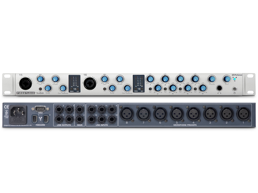 The FireStudio Tube is a world-class 24-bit/96k professional FireWire recording system loaded with the perfect combination of inputs and outputs for bands, producers, musicians and engineers to produce commercial-quality recordings. The front panel of the FireStudio Tube is loaded with two "SuperChannels" featuring class A vacuum tube microphone and instrument preamplifiers along with full-featured analog limiters. The tube preamplifiers use a high gain, military grade 12AX7 tube for maximum gain, low noise and high headroom. Neutrik combo connectors allow both XLR microphone input and hi-Z instrument input. Preamp controls include preamp gain and tube drive to achieve a wide range of sounds from smooth, clean and clear, to warm tube saturation. An 80Hz high pass filter is also located on the front panel to remove room rumble and unwanted lows.